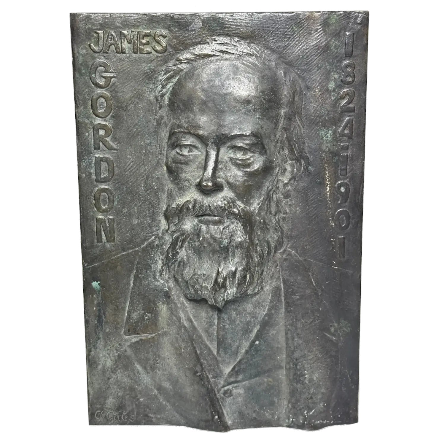 • He is a man Immortalized in fine bronze metal. This striking bronze relief captures James Gordon with a dignified presence, his bearded visage exuding wisdom and contemplation. The artist has skillfully rendered his facial features with depth and realism, achieving a lifelike quality that conveys both the strength and introspection of a man of his era. The relief is framed with his name boldly inscribed, ensuring that his identity remains as indelible as the metal itself.