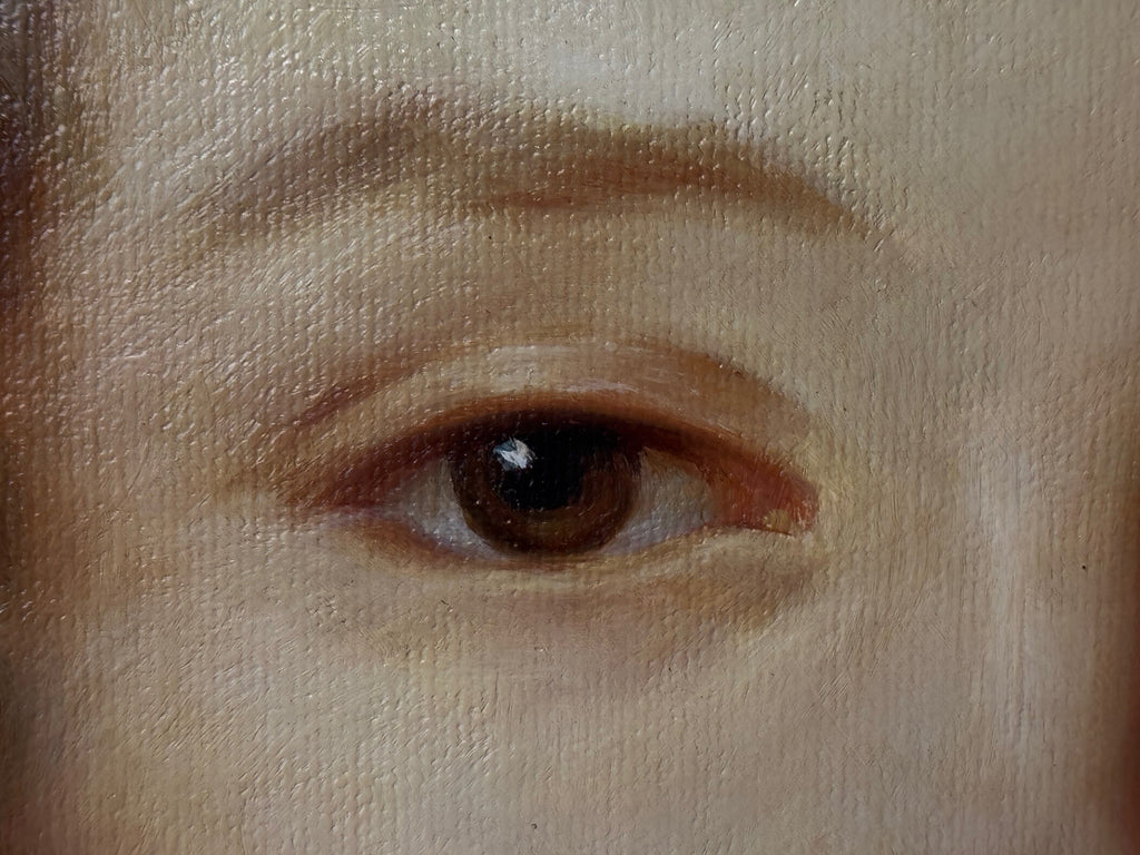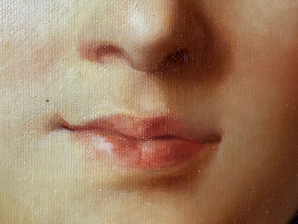 • Smooth, nearly invisible brushwork in the flesh contrasts with subtly more active strokes in the metal surfaces