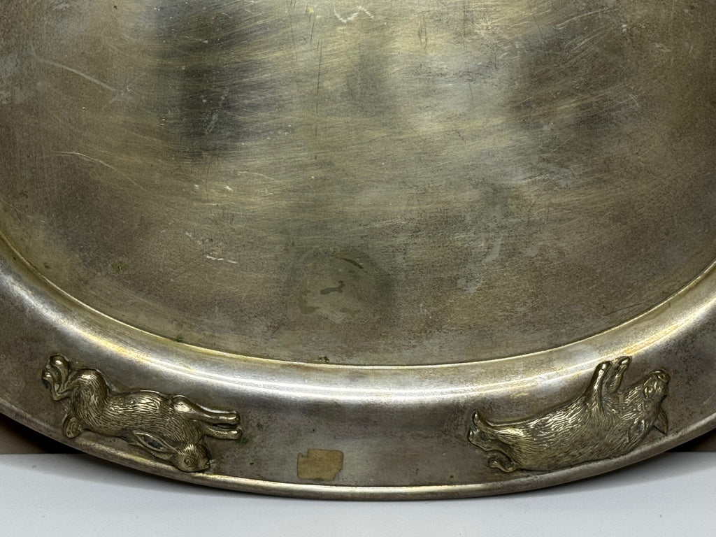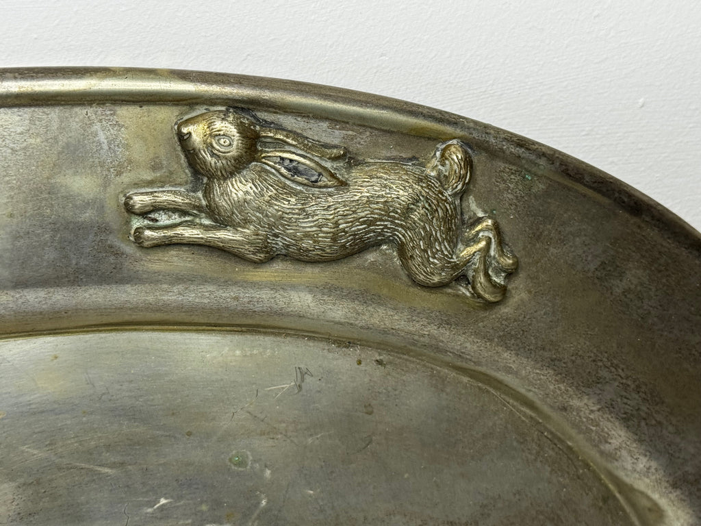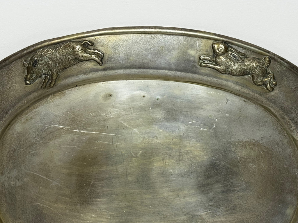 This rare Danish silver-plated platter showcases a richly detailed repoussé hunting scene, typical of the Victorian taste for sporting motifs. The wide border is alive with wild boar, pheasants, and rabbits in high relief, embodying the energy and artistry of 19th-century silverwork. Crafted in silver plate over copper or base metal, it combines the brilliance of silver with the resilience required for table service.
