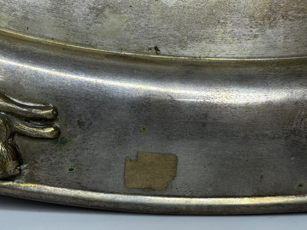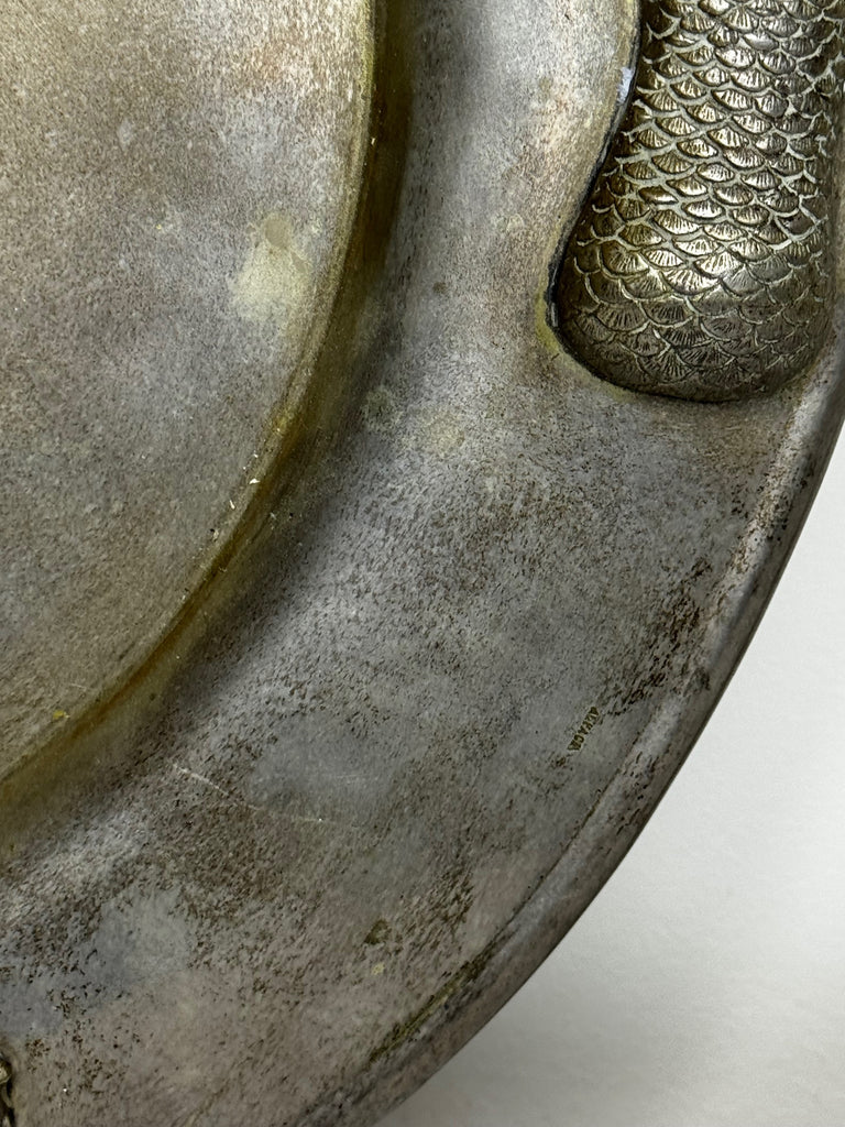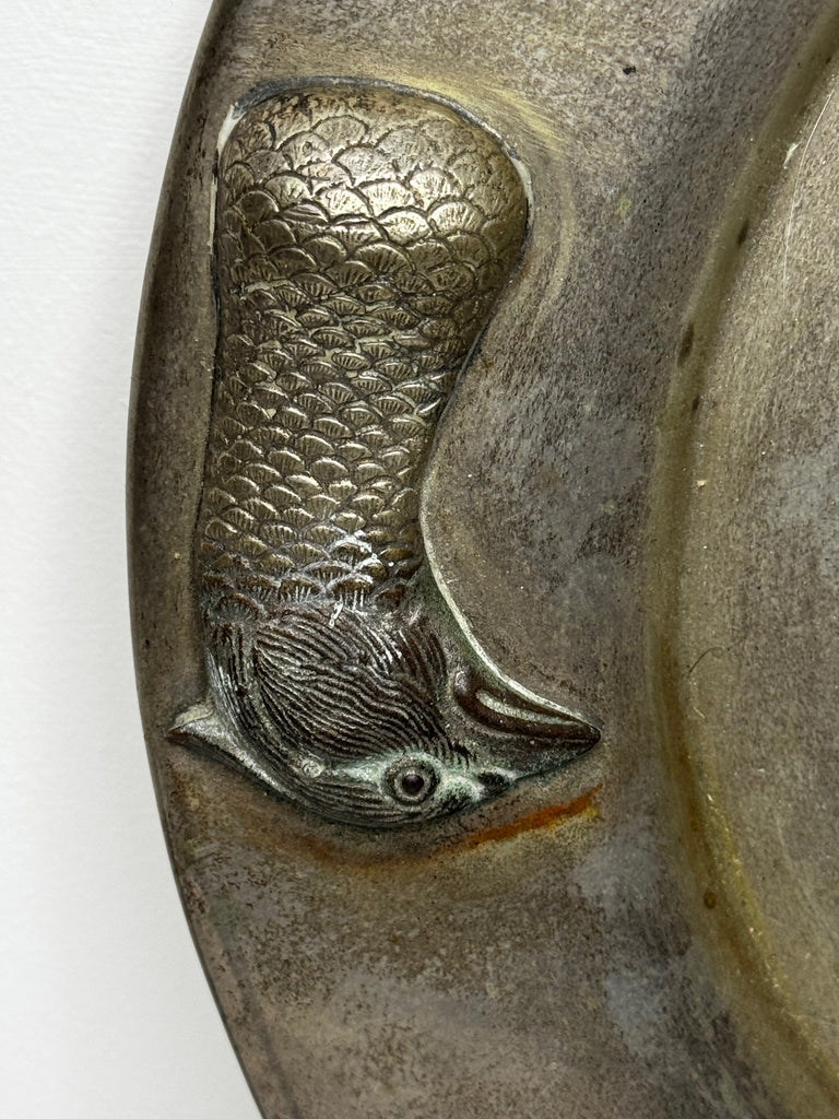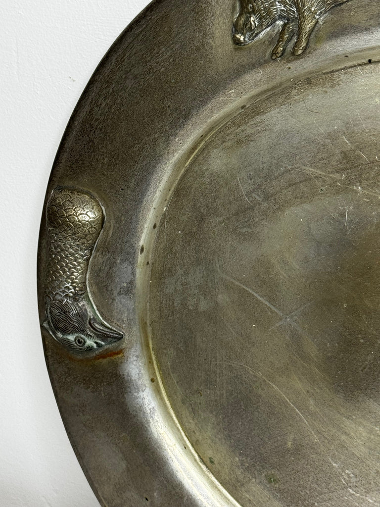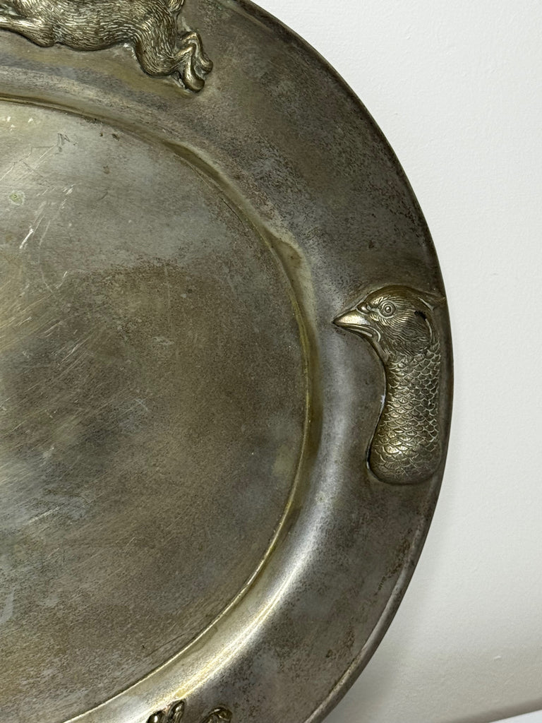 The central plain surface was intended for carving and presenting meats, while the broad repoussé rim brims with naturalistic detail. Executed using the traditional repoussé and chasing technique — hammering from the reverse and refining from the front — the craftsmanship is evident in every feather, muscle, and scroll of foliage. The result is a striking balance between function and ornament, making it both a serving piece and a work of art.