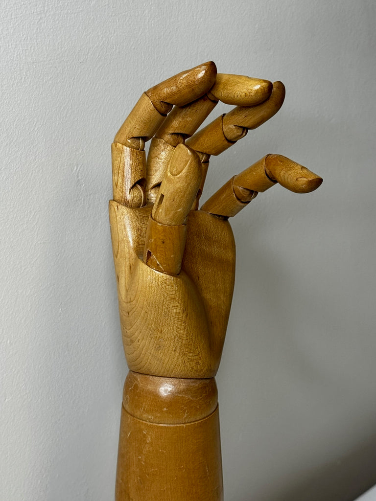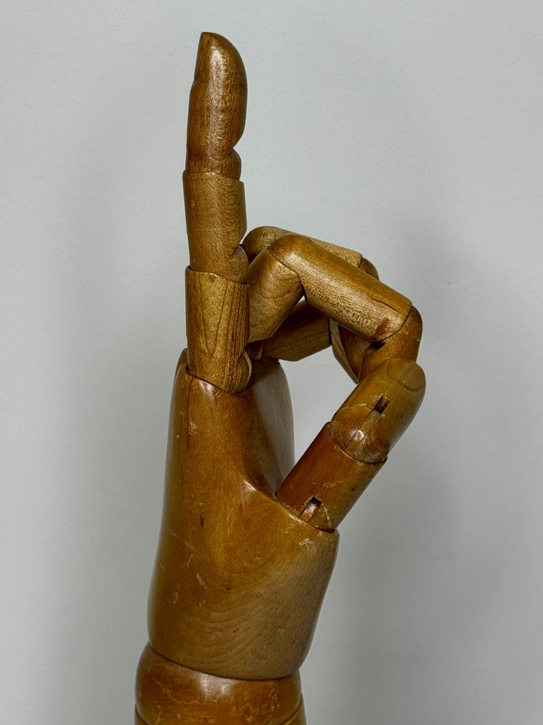 A rare and original c.1920 wooden articulated advertising counter display hand, created for the prestigious glove maker DENTS of Worcester, England (est. 1777).