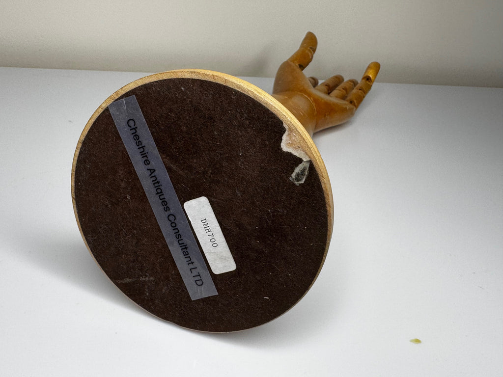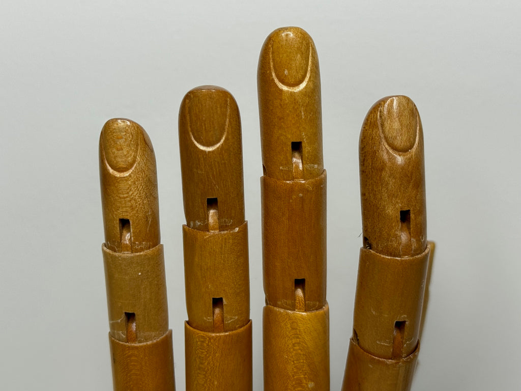 This display hand dates from the early 20th century—an era when gloves were an essential accessory. Articulated display models like this allowed shops to demonstrate both style and fit. Surviving examples are scarce, making this a highly collectible piece of fashion and retail history.