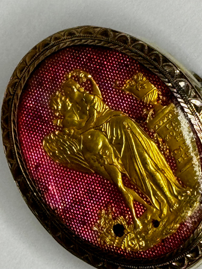 An exquisite Neoclassical French 18th Century oval sentimental brooch, c.1760, capturing the timeless myth of Cupid and Psyche. Crafted in delicate high-carat 14ct gold appliqué, the figures are set against a vibrant crimson woven silk ground, preserved beneath protective domed glass. The reverse is meticulously fashioned in silver-gilt, retaining its original elongated steel pin and open C-clasp. This harmonious union of gold, textile, and glass reflects the refined artistry of late Georgian sentimental jewels.