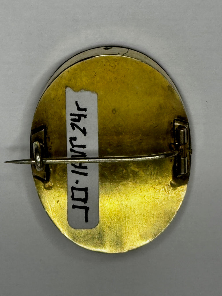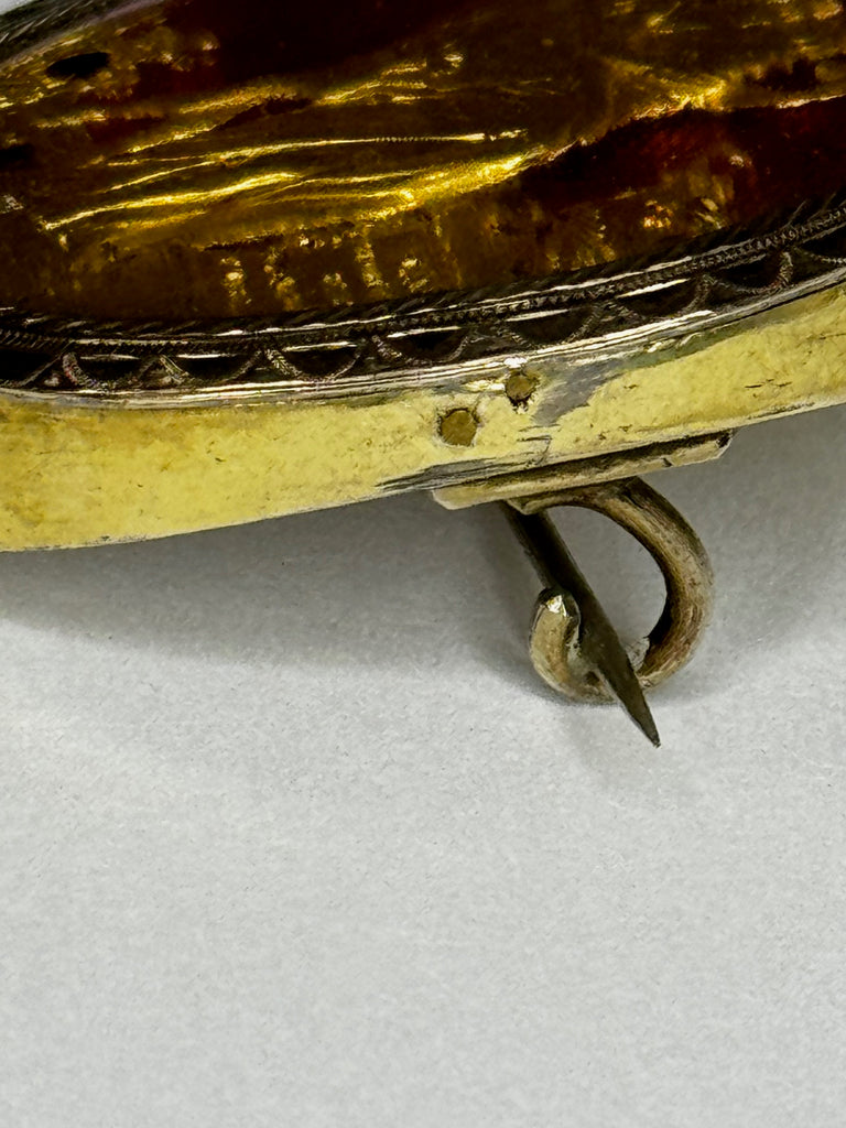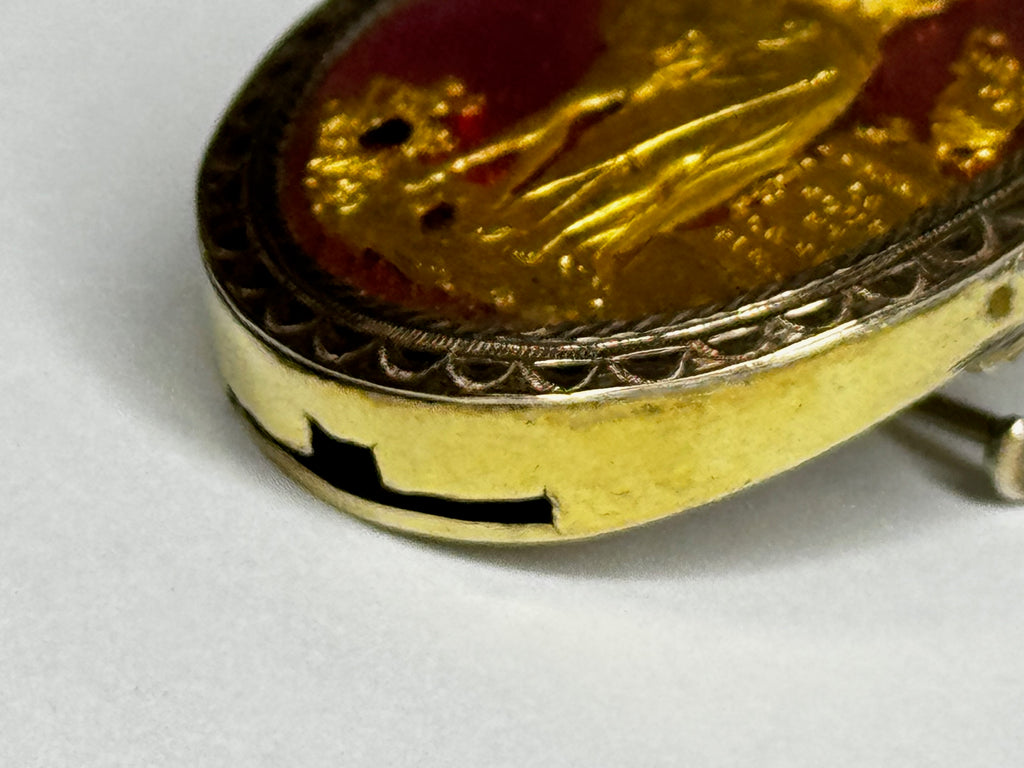 Fair to good antique condition. Gold appliqué figures remain intact with gentle wear. Red silk ground shows fading and minor losses. Reverse exhibits tarnish and partial gilt wear. Glass bears surface scratches; pin slightly bent but secure. Original fittings fully functional. Structurally sound with age-appropriate patina.