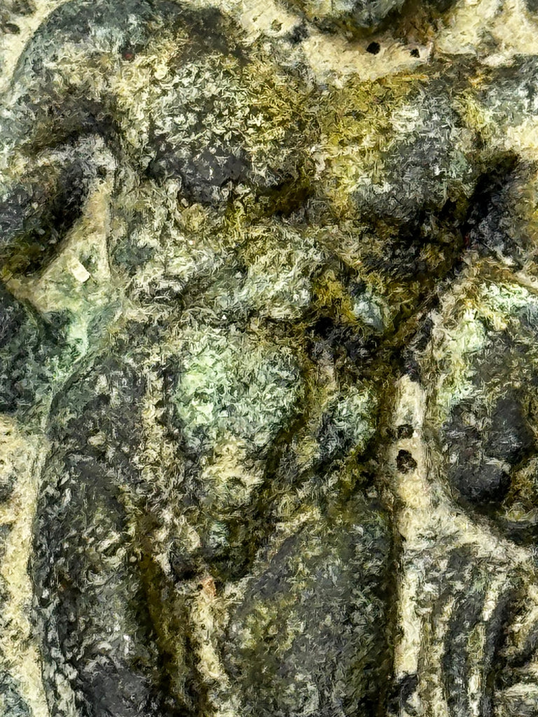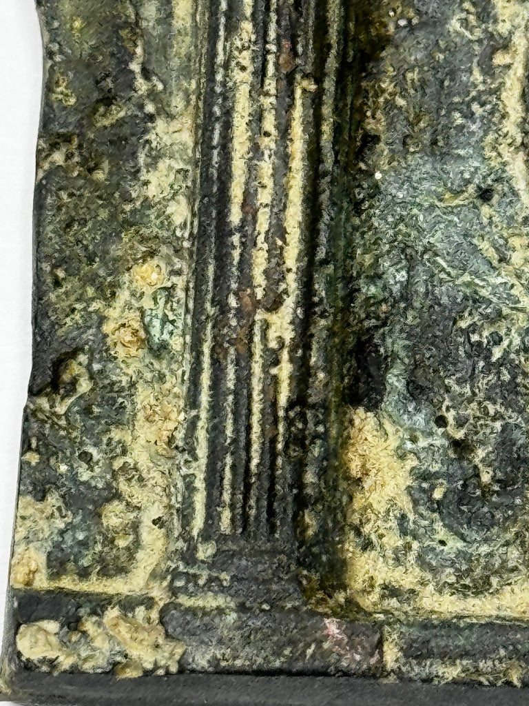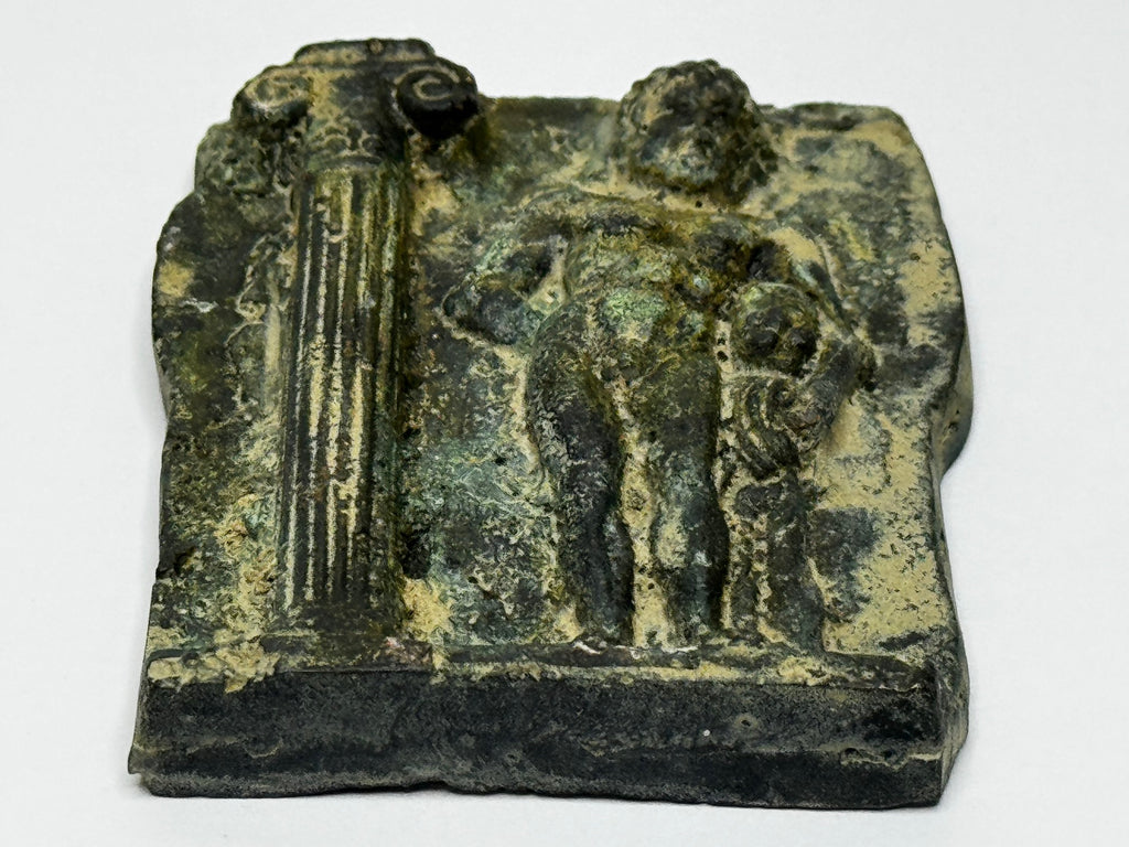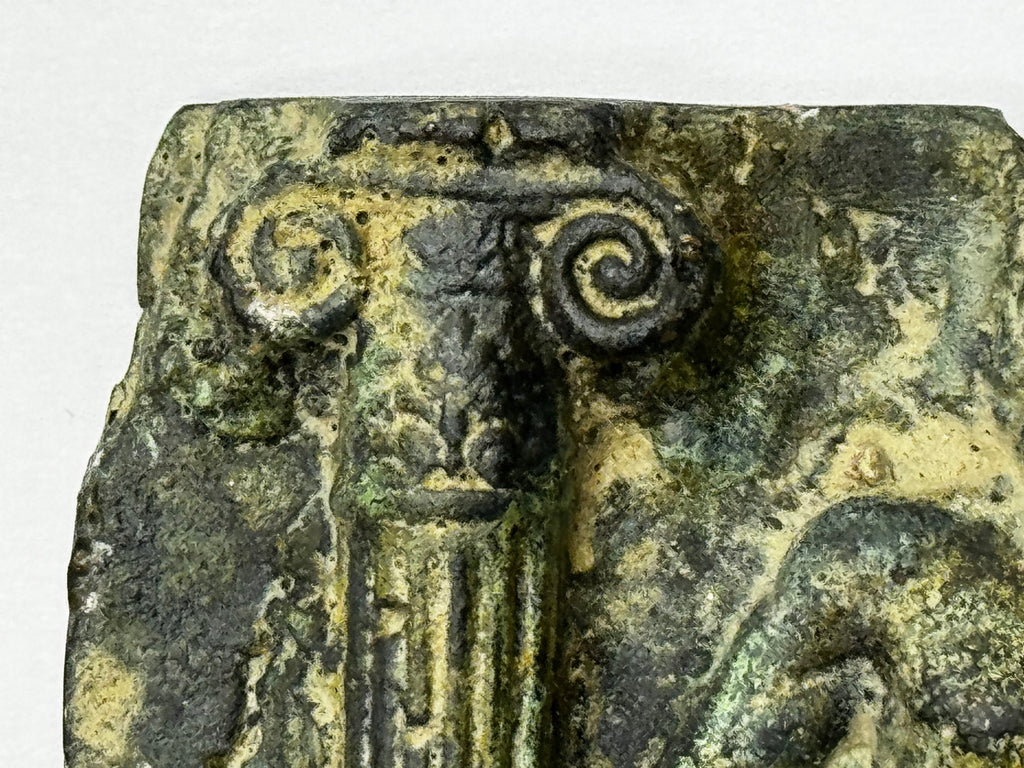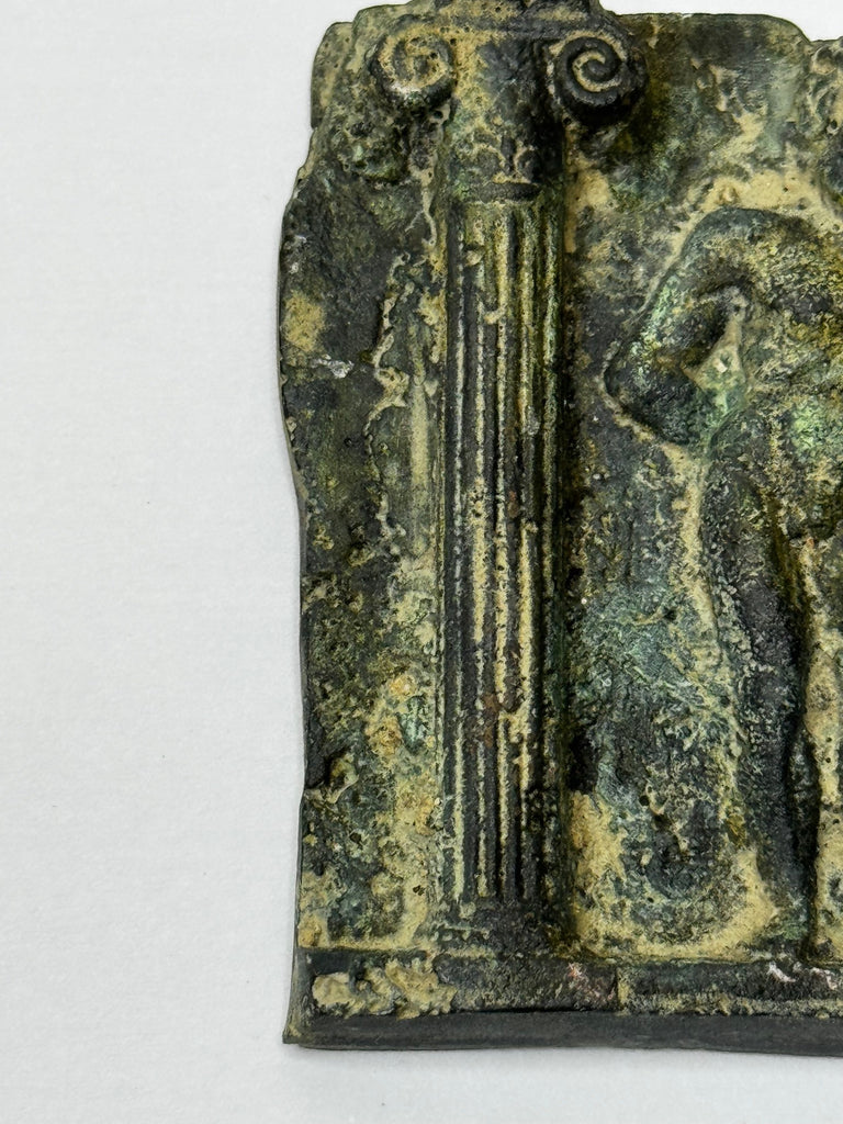 Small bronze mounts like this also reflect refined Roman taste: embellishments used on high-quality household and ceremonial objects to bring classical imagery into everyday spaces ✨. The Ionic column 🏛️ reinforces the elevated “classical” visual language and suggests a monumental or sacred setting.