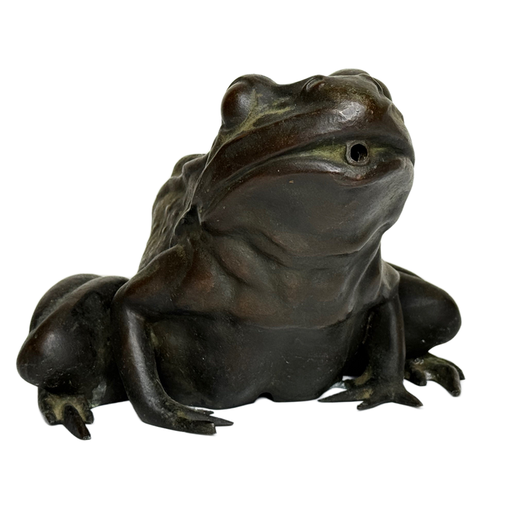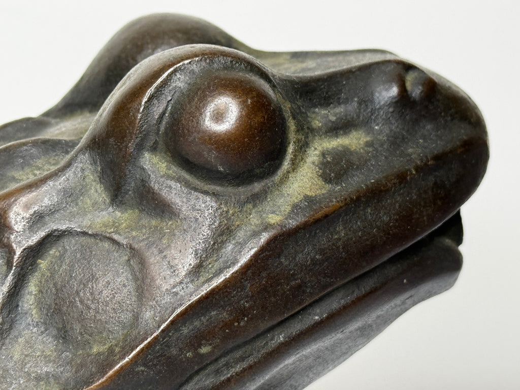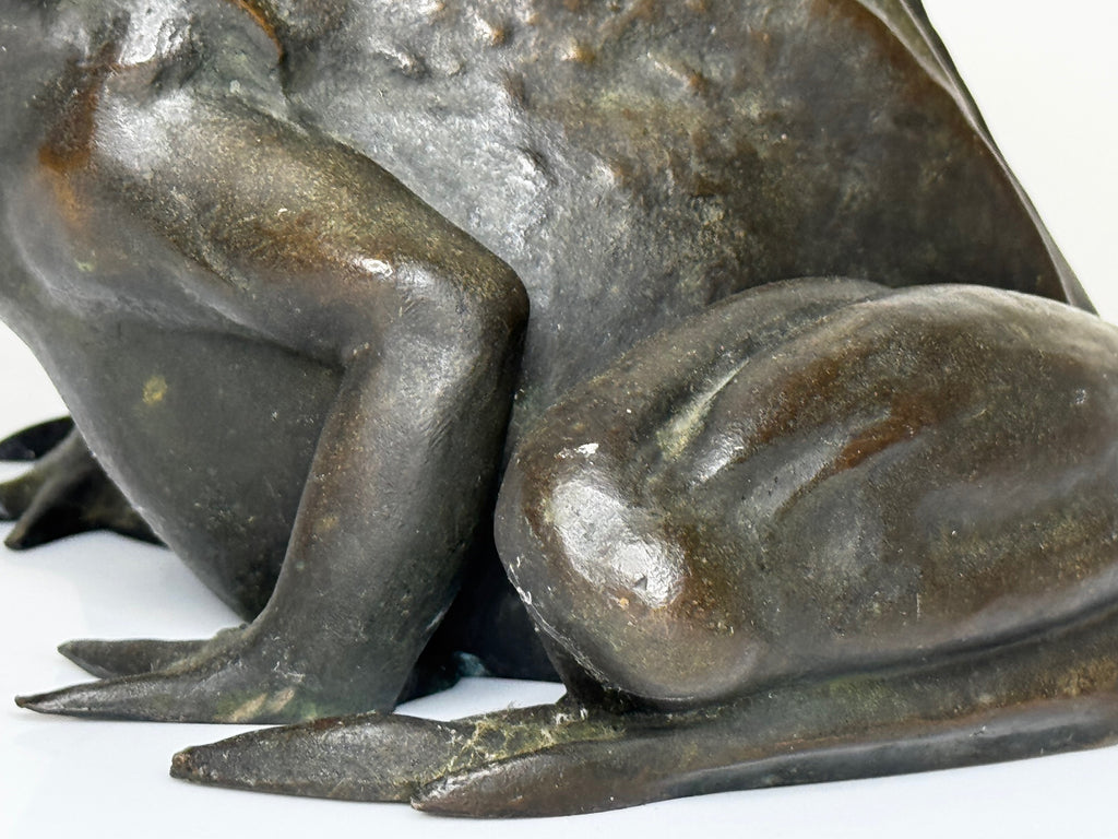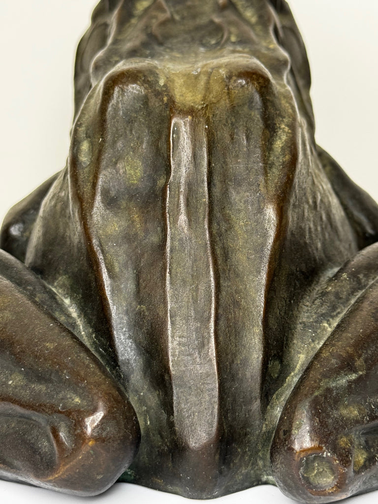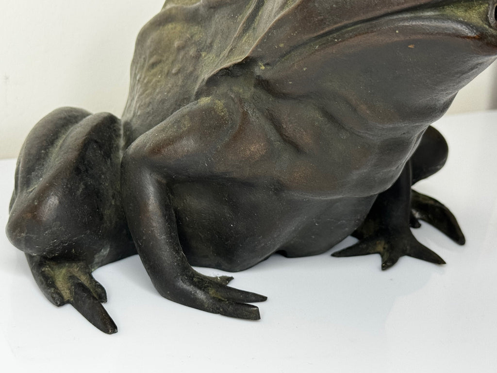 The design reflects the naturalistic style of the Victorian and Edwardian garden art movements, merging classical realism with organic expression. The frog’s limbs are muscular and tense, its body slightly hunched as if poised to leap, and the surface is carefully textured to suggest the slick skin of an amphibian.