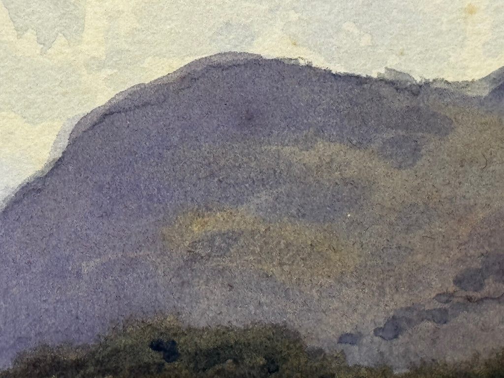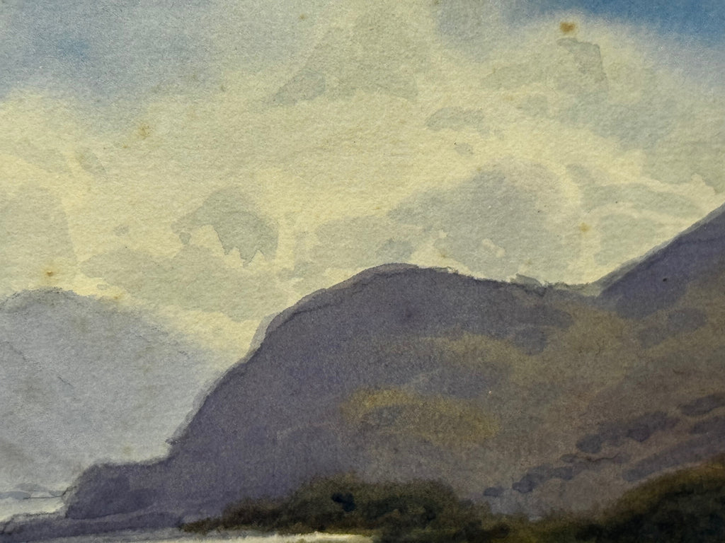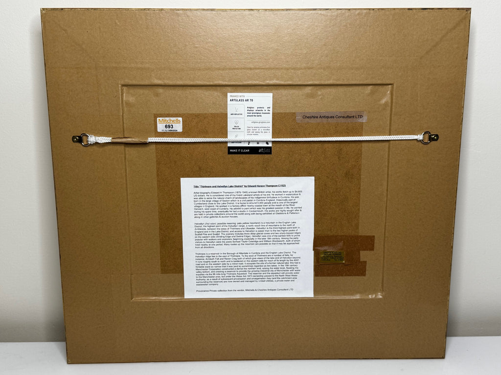 This atmospheric watercolour painting by Edward Horace Thompson beautifully captures a Lake District view in Cumbria, featuring the serene Thirlmere reservoir with the majestic Helvellyn mountain rising beyond. Executed on paper and protected under glass, the piece preserves its delicate tones and refined brushwork. Dated 1925.