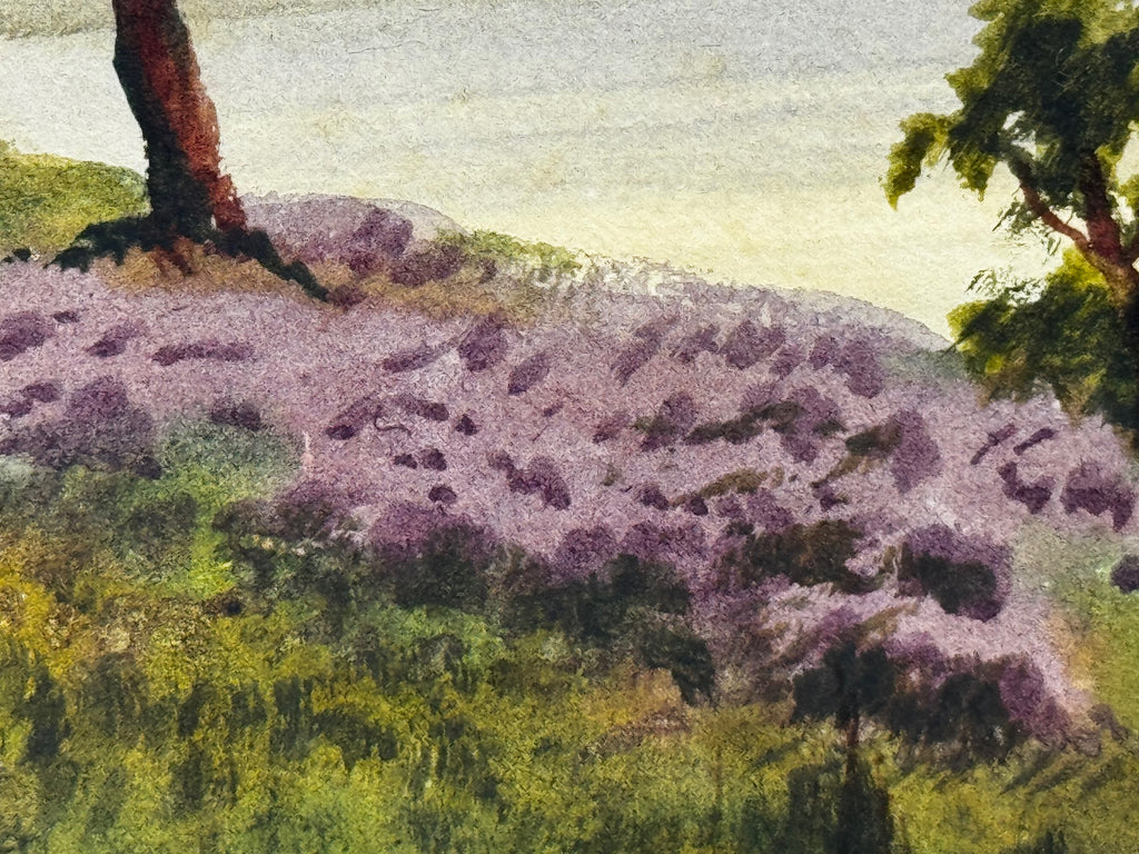 Thompson’s keen perspective draws the eye naturally through the scene. Light and shadow are balanced with mastery: shimmering white highlights dance on the lake, contrasting with deeper passages of water. In the foreground, vivid green grasses, purple heather in bloom, and a lone upright tree create depth and interest. Behind them, sloping hills and mist-veiled peaks fade into the distance. The left-hand slopes glow in golden light, while above, shifting clouds part to reveal touches of blue sky. His palette — greens, browns, purples, whites, greys, and blues — achieves a lively yet harmonious landscape.