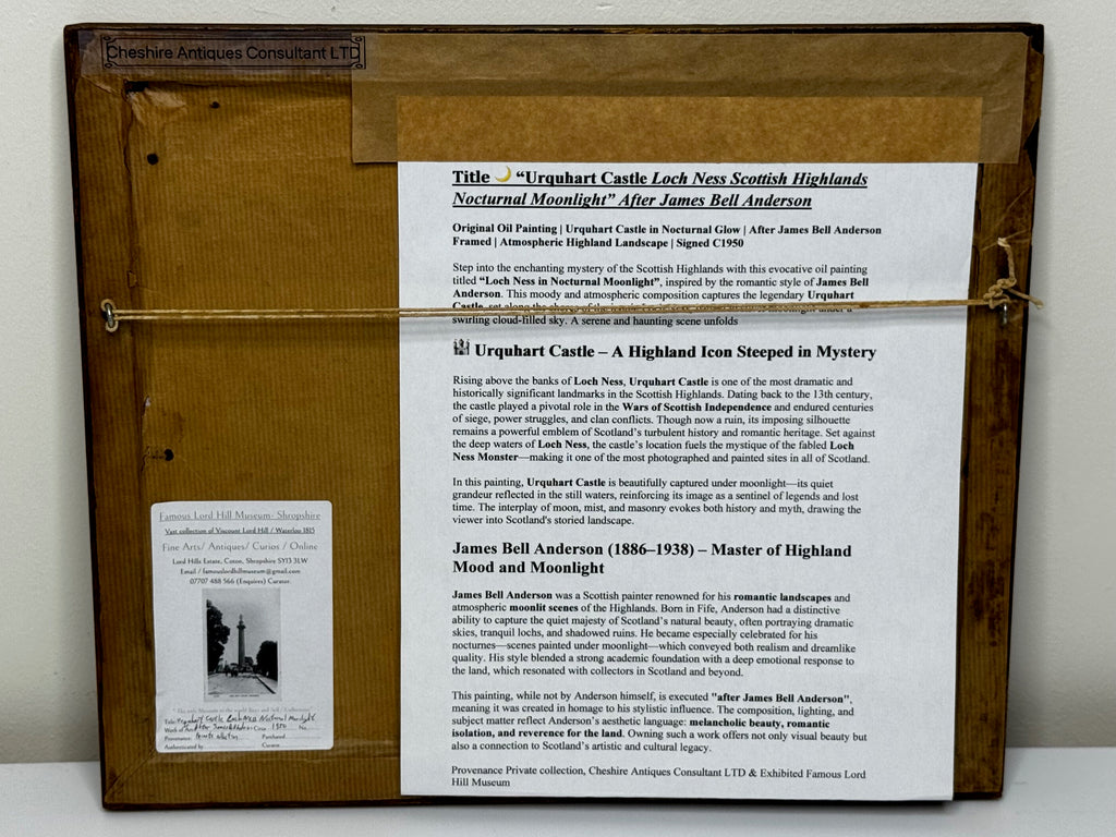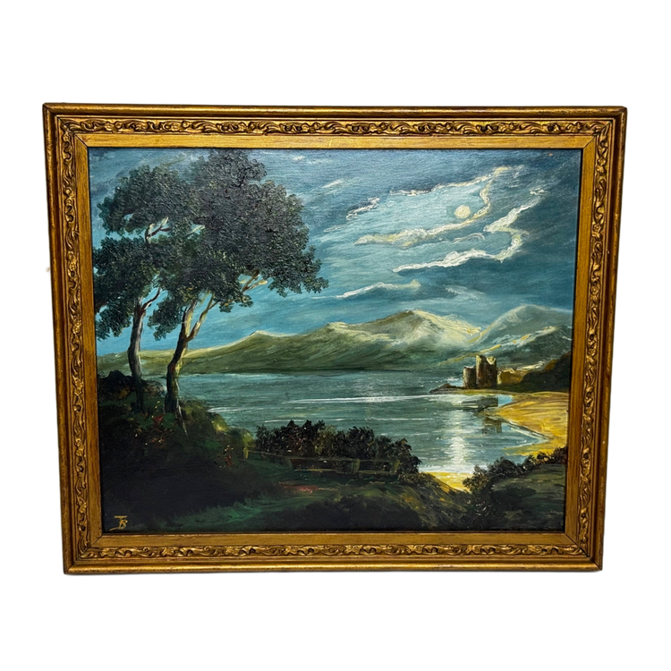 Step into a dreamscape of Highland mystery and romantic moonlight with this captivating original oil painting on board, circa 1950. Titled Moonlight Over Loch Ness – Urquhart Castle in Nocturne, this evocative work captures the haunting beauty of Scotland’s iconic Urquhart Castle under a silver-lit sky.