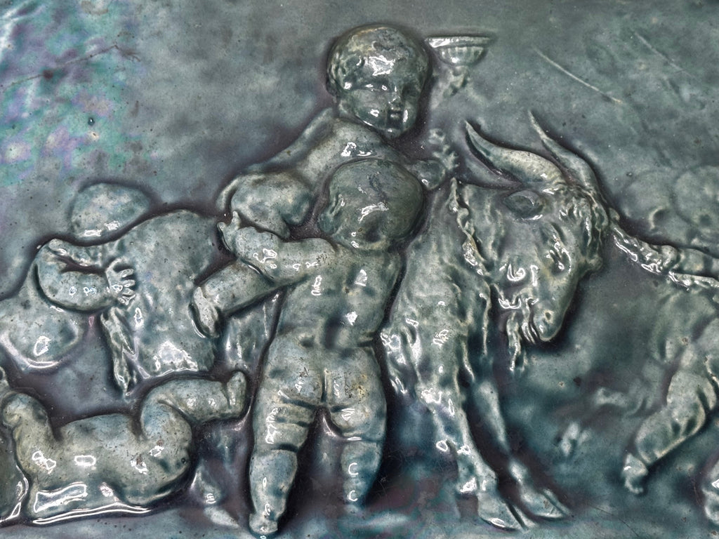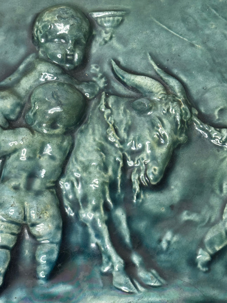 • Children with Dog 🐕: Cherubs wrestle with a powerful hound, ropes taut as one child rides astride its back. The dog’s musculature conveys strength and movement, while Tomlinson’s glazing gives surface and depth.