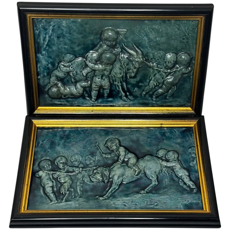 Well-preserved pair of ceramic reliefs with original glazing. Later matching frames, with some wear and touch-ups.