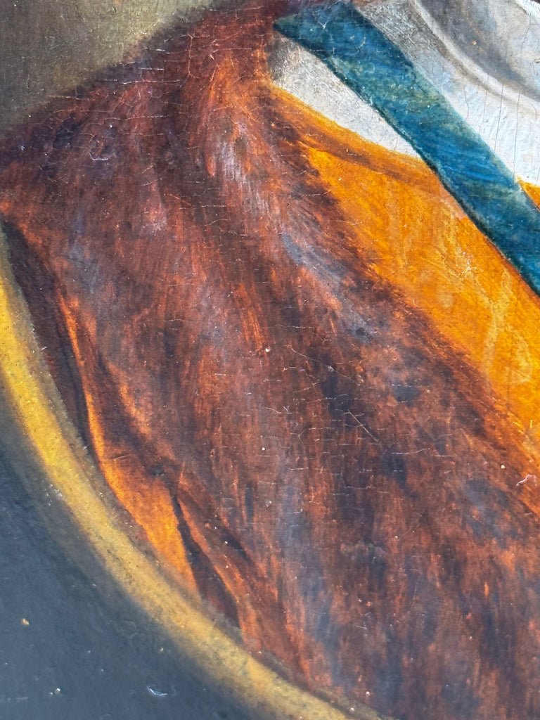 The jewelled cap and feather plume are crisply defined, while highlights along the collar and insignia provide dimensional lift. Age-consistent craquelure across the surface reinforces authenticity without disrupting visual coherence.