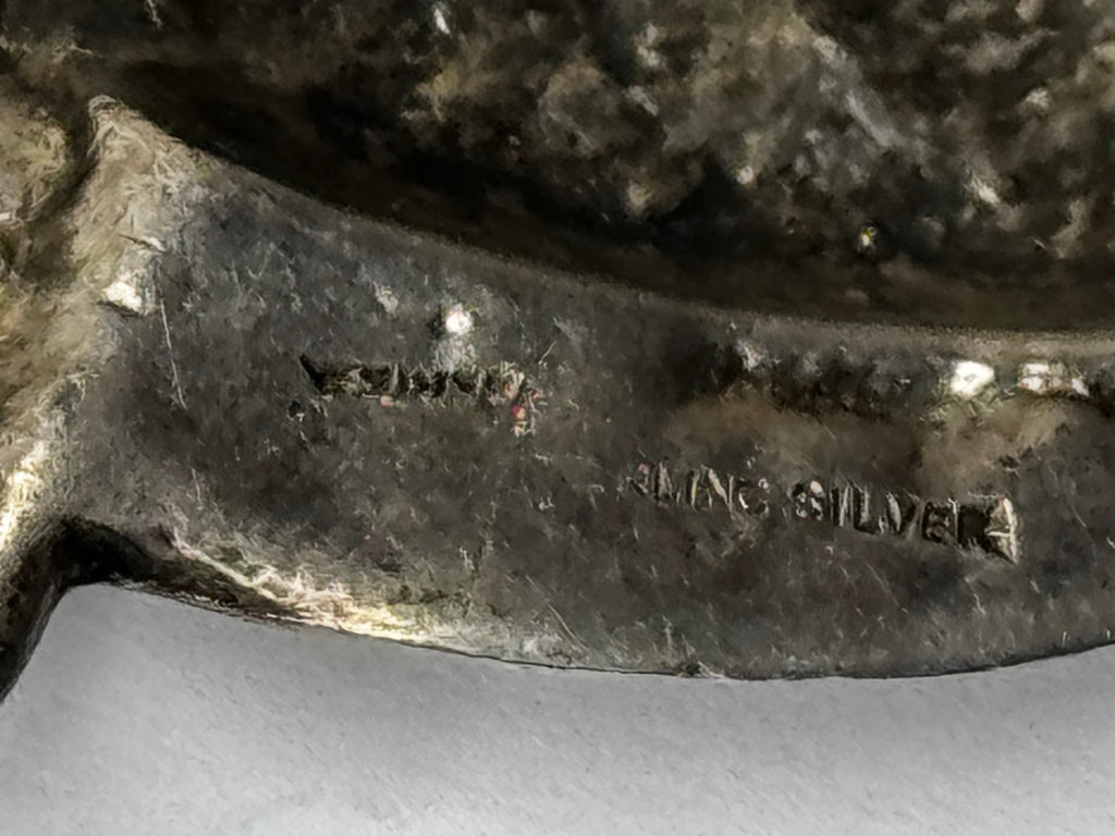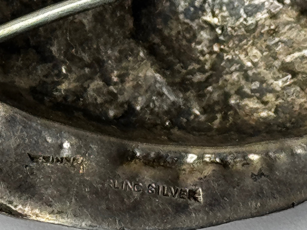 Presented in good vintage condition, commensurate with age and prior wear. Expect light surface scuffs and fine scratches visible under close inspection, along with areas of natural tarnish/patina—particularly in recesses and textured zones—which enhances contrast and definition ✨. The purity mark is partially struck/partially worn, reading “STER / …LING SILVER”, consistent with age and handling. No obvious splits or repairs are apparent in the provided images. As with all vintage pins, the clasp/hinge should be checked prior to dispatch.