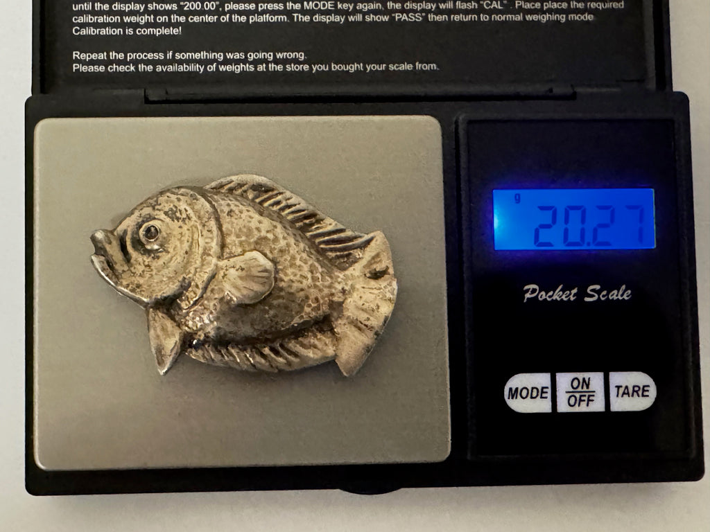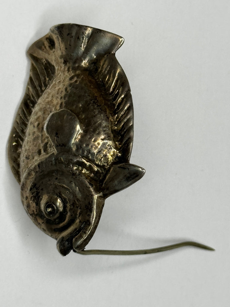 The bream silhouette is articulated through a softly modelled head with defined lips, a rounded body, and crisply simplified fins. What elevates this piece—particularly for discerning modernist jewellery collectors—is the surface handling: a subtly planished / pebbled texture that throws shifting highlights across the body, contrasted with smoother, slightly raised areas that provide structure and visual rhythm ✨. In wear, it performs especially well on darker textiles—cashmere, navy wool, black tailoring—where the texturing catches the light without looking overly bright or “new” 🌊🧥.