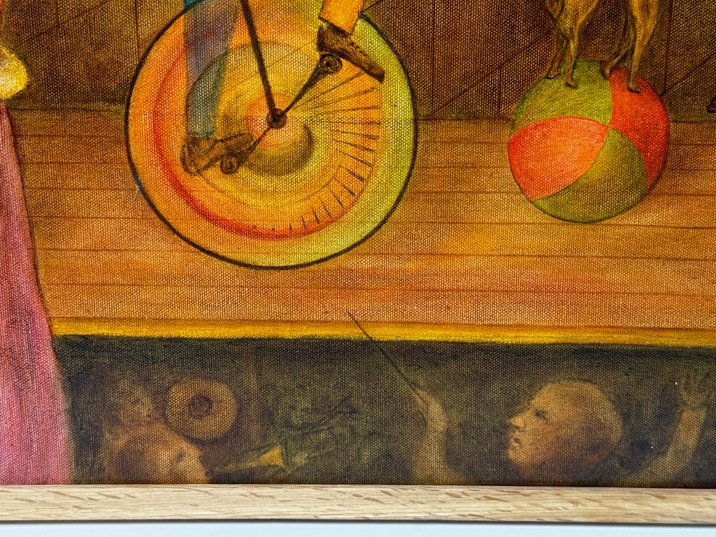 A poised circus figure balances delicately on a unicycle beside a resting dog, framed by a gently draped red curtain. In this still, dreamlike scene, Eagle explores the emotional tension between spectacle and silence — a predominant theme within Lyrical Surrealism, notably inspired by Paul Delvaux. His figures exist in a world both staged and contemplative, inviting viewers into a poetic realm of hushed drama.