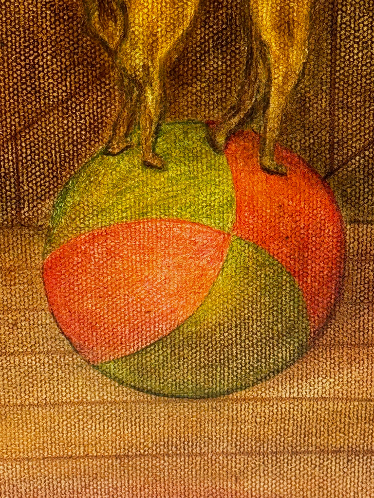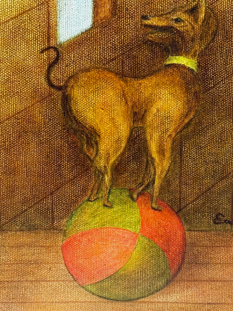 The calculated balance between figure, animal, and architectural frame evokes meditation on poise, solitude, and artistic discipline. Fine, translucent layers create a soft luminance across the stage-like setting, resulting in a work that feels timeless — a quiet dream held in perfect equilibrium.