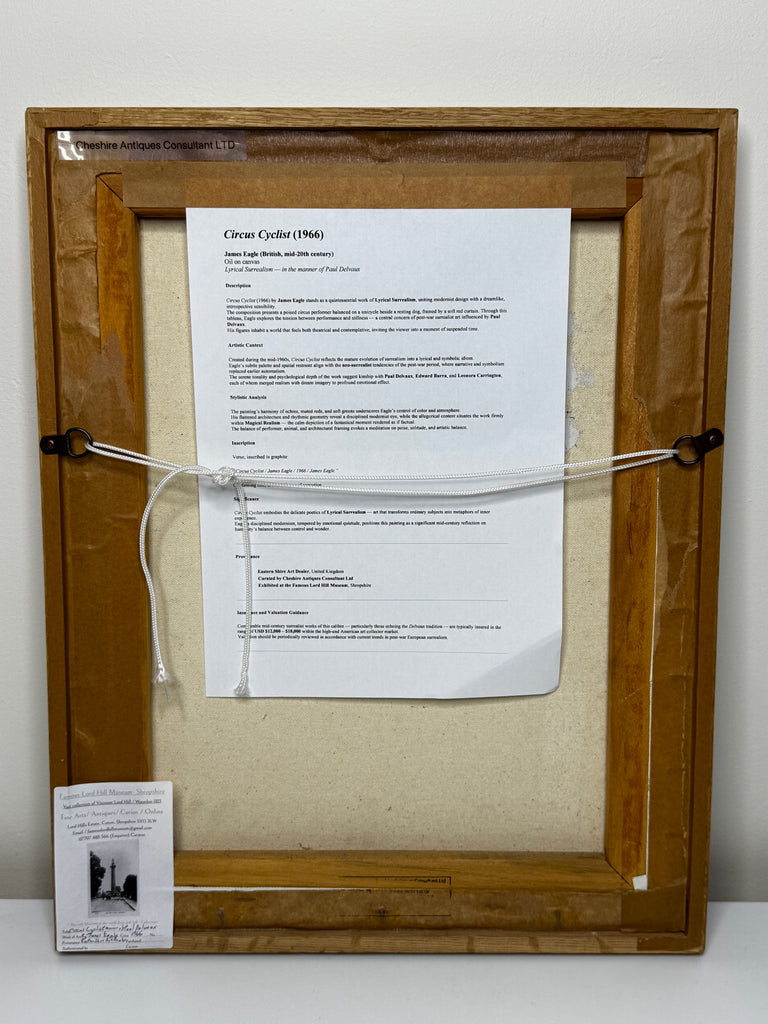 Circus Cyclist” (1966) by James Eagle — British Lyrical Surrealism in the Spirit of Paul Delvaux — Oil on Canvas with Provenance & Exhibition History