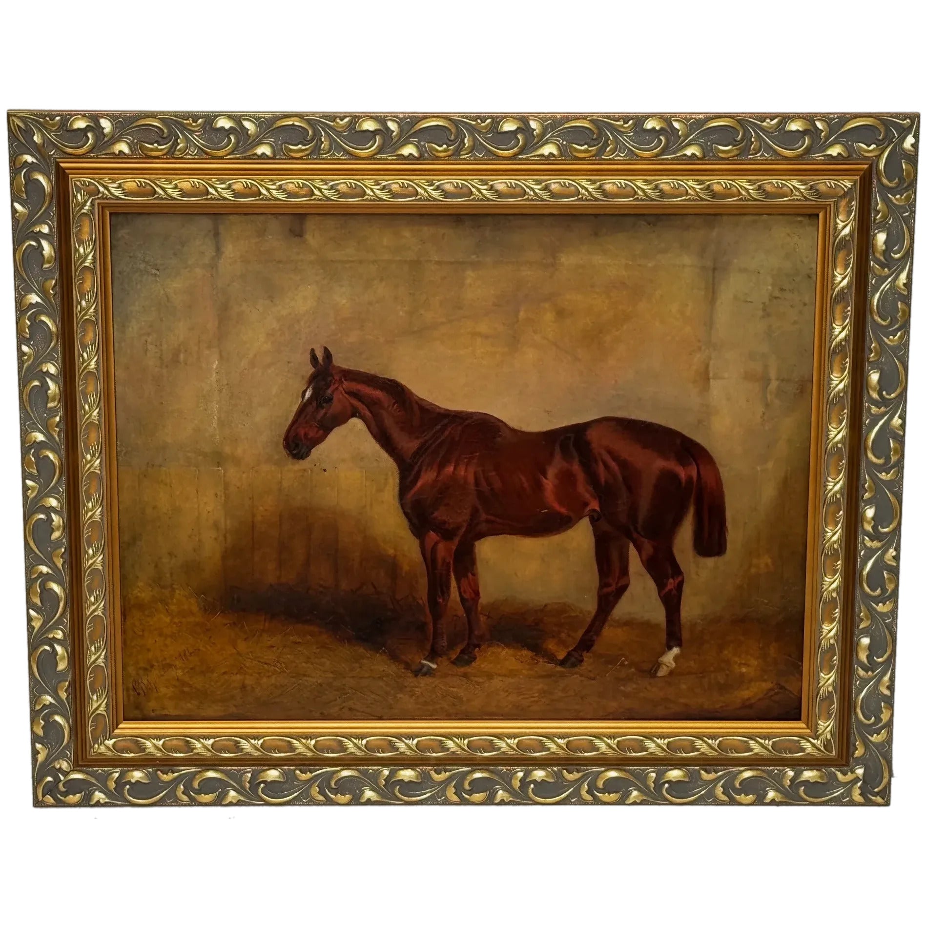 Spalding’s brushwork is exquisite: delicate, controlled strokes define the horse’s musculature and subtle hair textures, while broader, more expressive handling in the background introduces depth, softness, and painterly charm. The color palette glows with layered chestnut reds, honeyed browns, warm ochres, soft umbers, and muted shadows, creating a beautifully balanced, harmonious work. Spalding’s style merges realism with atmospheric richness, perfectly capturing the horse’s grace and quiet strength.
