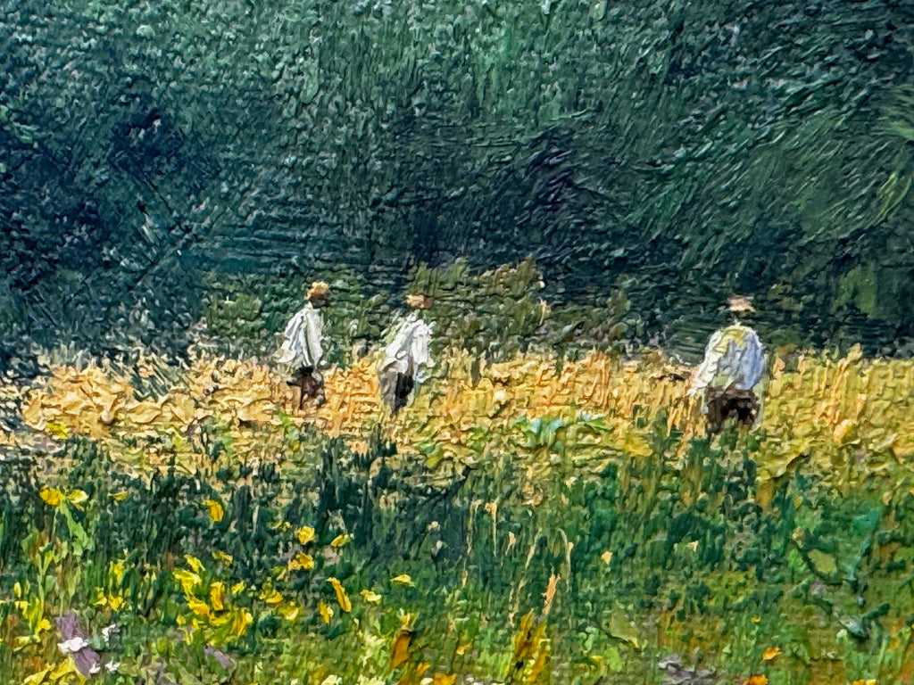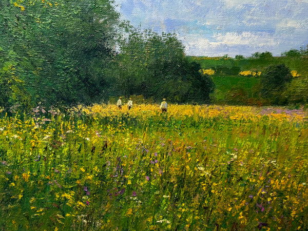 The middle distance draws your eye to hedgerows and far-off fields, with three small farm workers — dressed in white shirts and hats — walking along the banks of the shimmering River Wye.