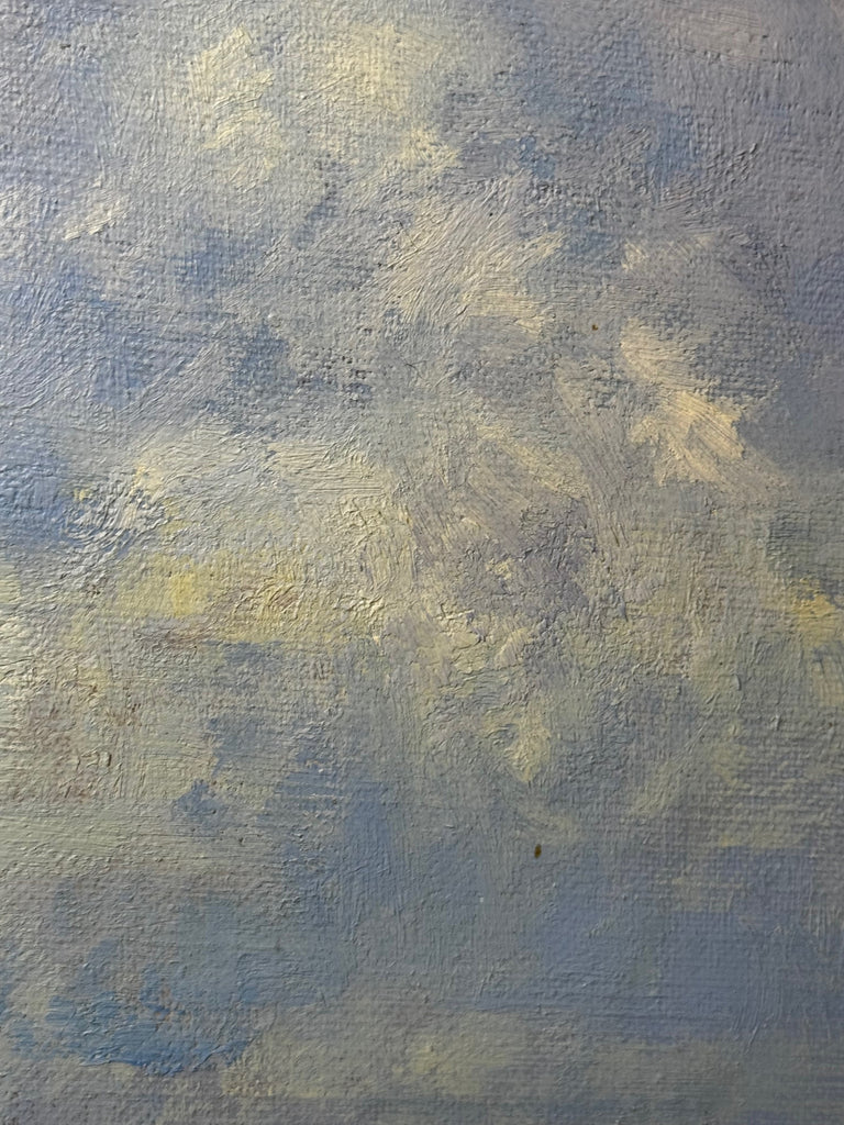 Above, the pale blue sky stretches wide, dotted with delicate, feathery clouds applied in broad impressionist strokes.
