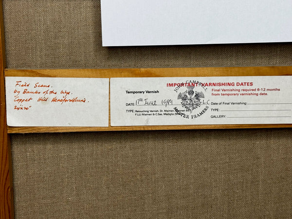 The artwork features Coppet Hill, a striking landmark in the Lower Wye Valley, south of Goodrich, Herefordshire. Known for its breathtaking panoramic views, rolling limestone slopes, and seasonal bluebell blooms, Coppet Hill has inspired artists and nature lovers for generations. Neal’s masterful brush captures the calm, the colour, and the character of this beloved landscape. Circa 1989.