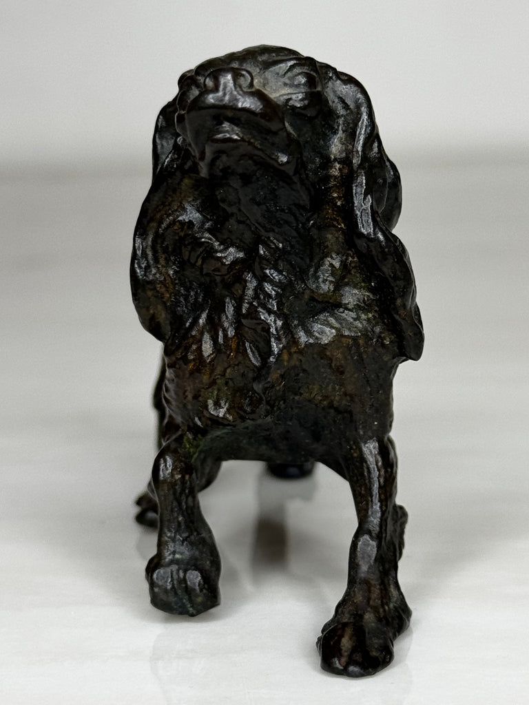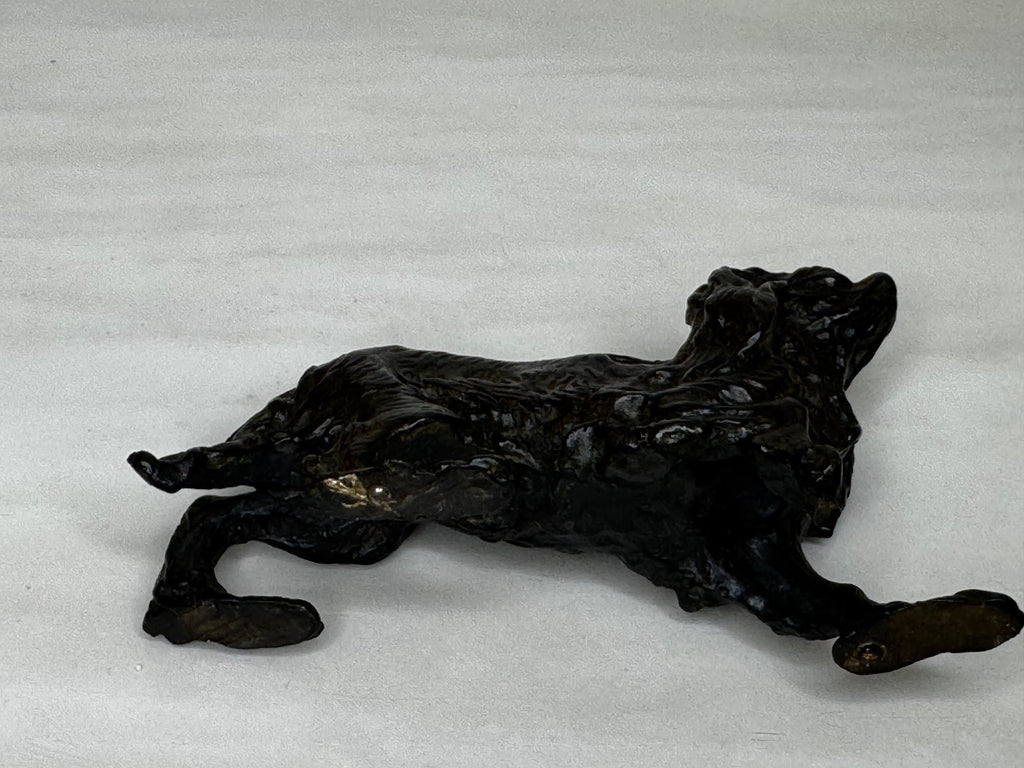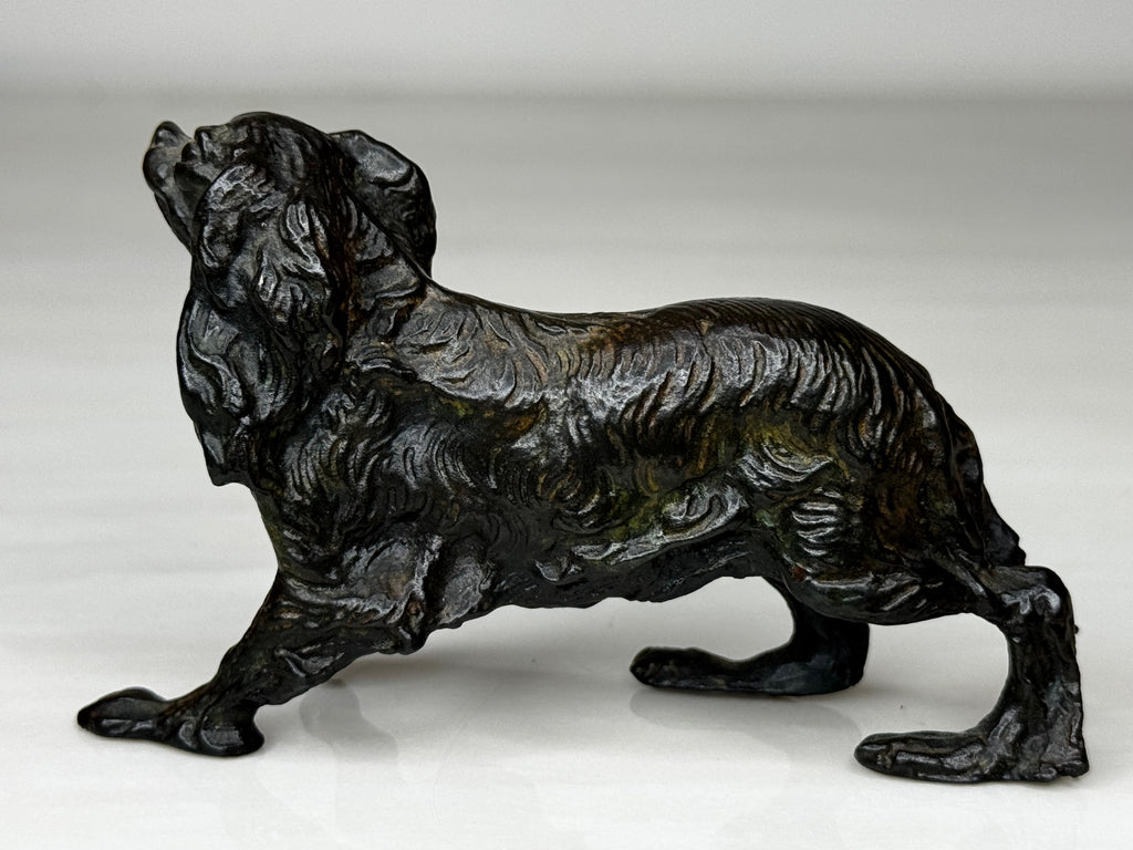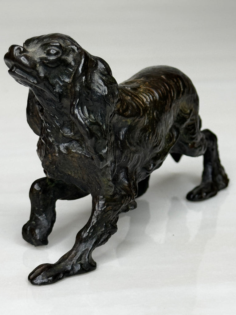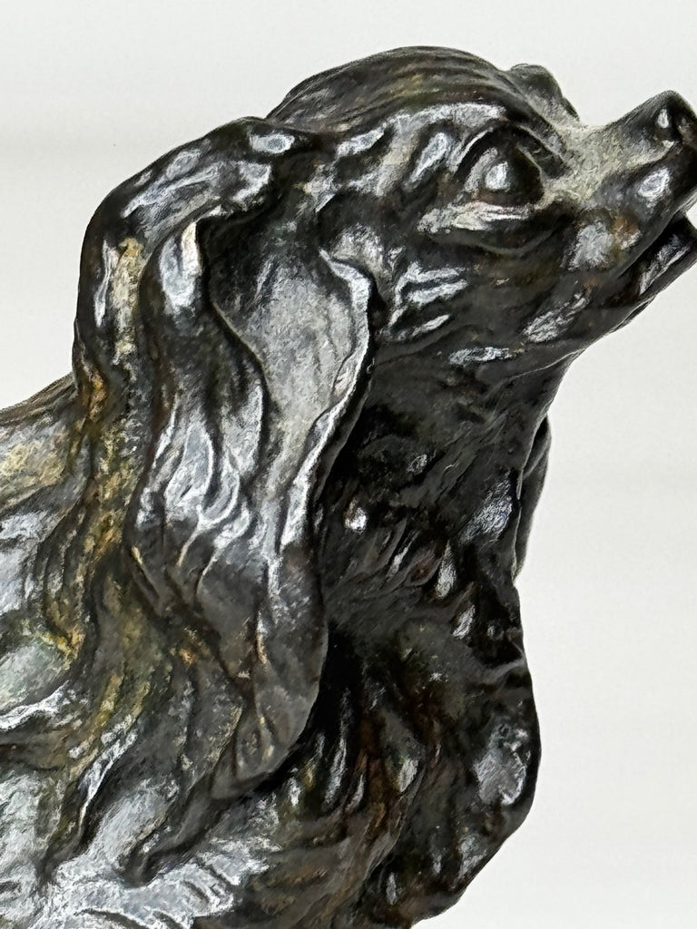 The Dachshund (Teckel) was a favoured subject in Austrian and German bronze workshops around 1900, reflecting the breed’s popularity among sporting and aristocratic circles. This example successfully captures the defining characteristics of the long-haired variety: elongated body, low stance, deep chest, short sturdy legs, feathered ears, and an alert, intelligent expression.