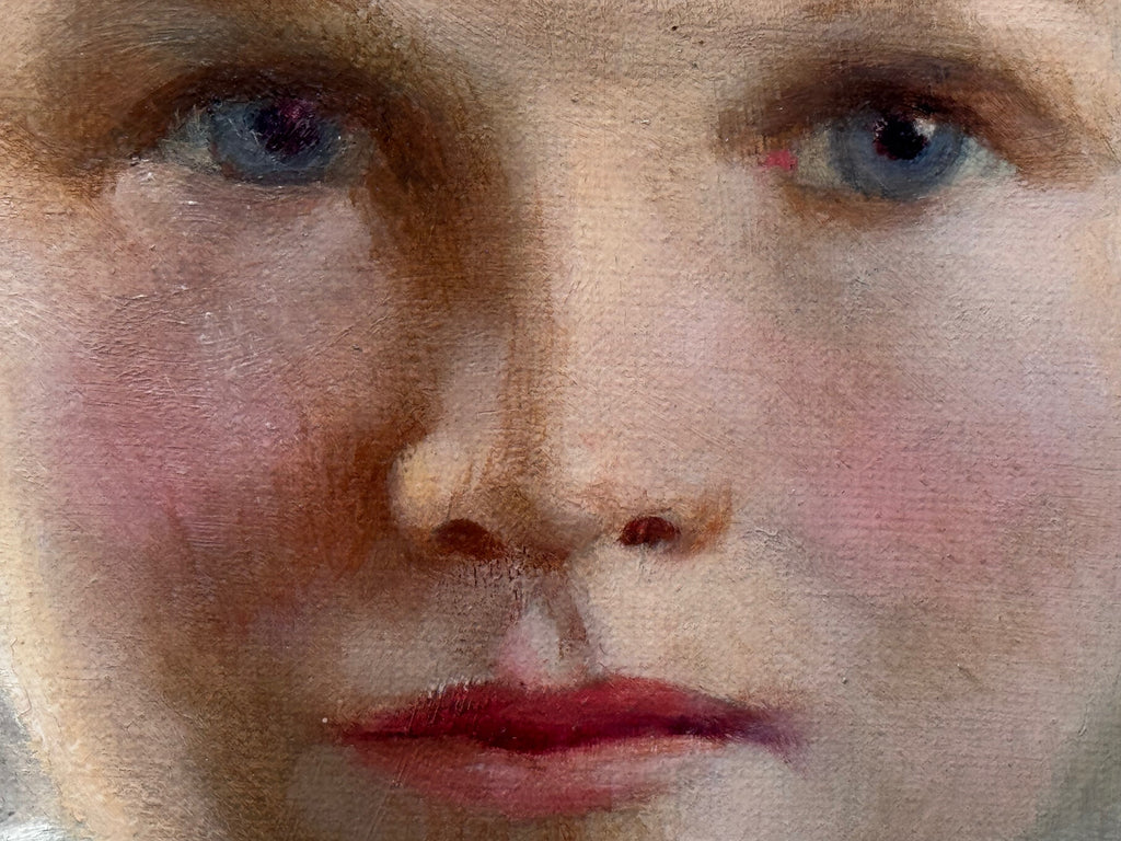 The composition is anchored by Mary’s serene expression. Her soft blue eyes, gentle blush, and slightly parted lips convey a contemplative, intimate mood. She appears calm and self-possessed, offering the viewer a moment of stillness and quiet reflection.