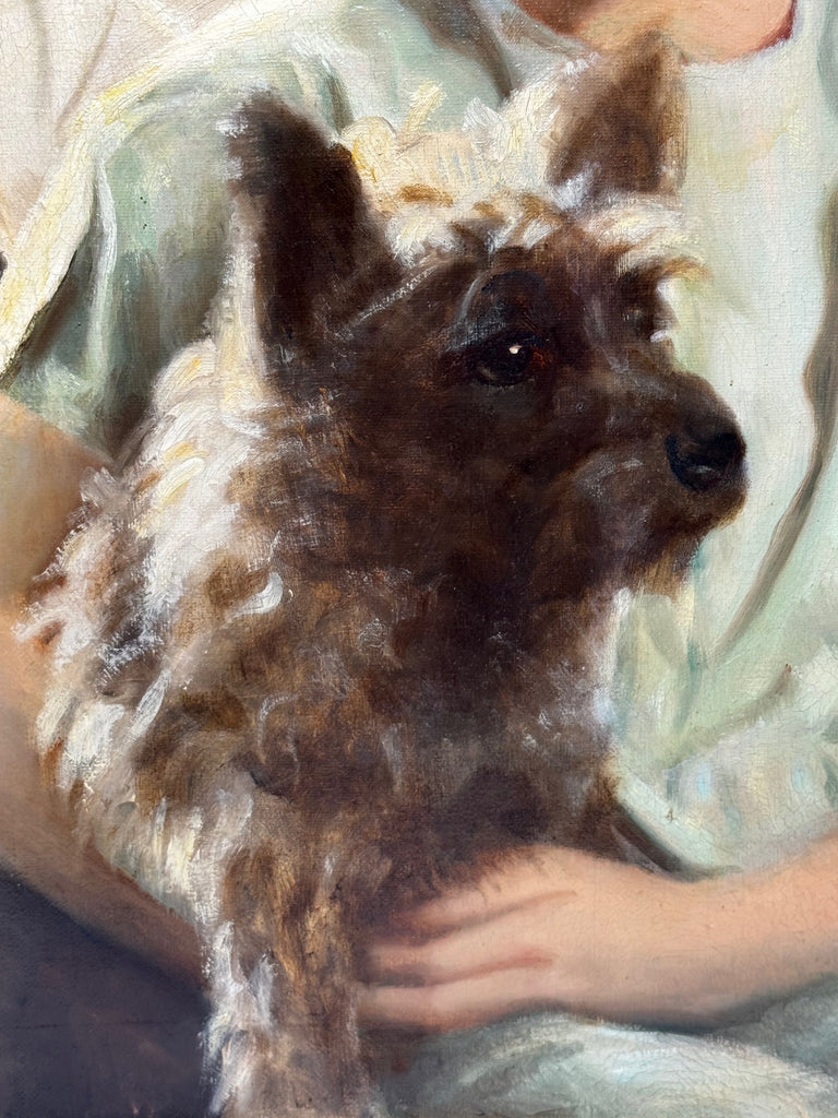 The Cairn Terriers—favoured by Britain’s royal household during the 1930s–40s—add a note of playful companionship, enhancing the nostalgic mood and sentimental grace typical of interwar portraiture.