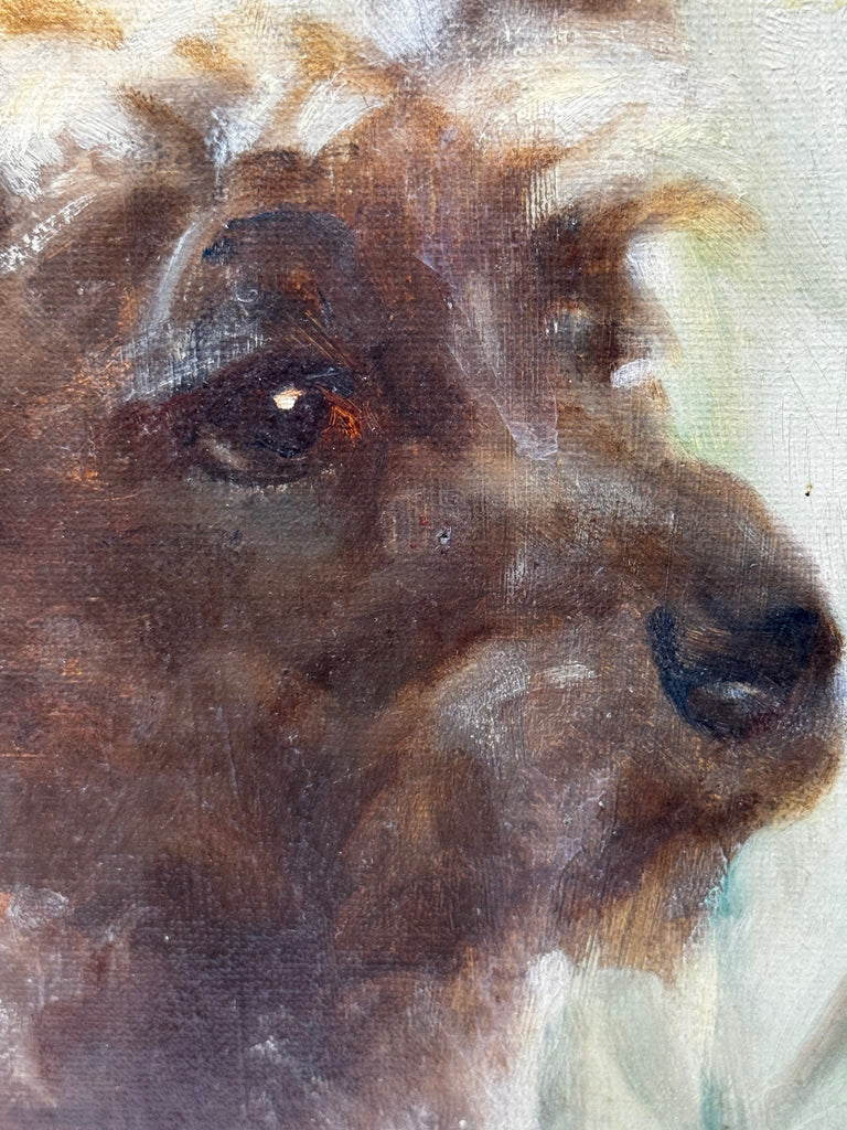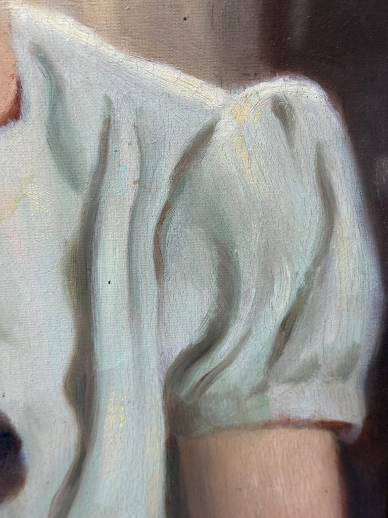 A tender and atmospheric oil portrait of Mary, a young girl accompanied by her two Cairn Terriers. Painted circa 1940, this charming work distils the warmth and refinement of early twentieth-century British domestic portraiture. Soft natural light and a harmonious pastel palette gently illuminate the scene, capturing the affectionate bond between child and pets with disarming sincerity.