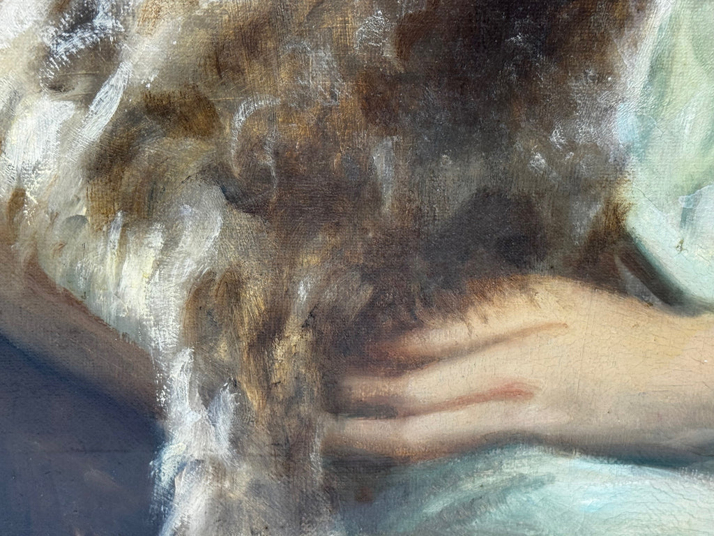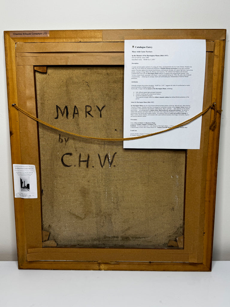The artist’s use of diffused light, controlled tonal balance, and harmonious colour relationships recalls the Harrington Mann tradition—marked by elegance, compositional restraint, and romantic realism. The terriers’ coats are described with lively, expressive brushwork, providing a delightful textural contrast to Mary’s softly modelled features.