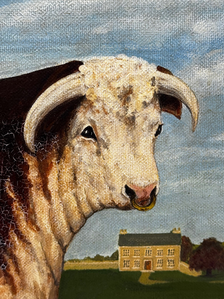 In the middle distance, a Georgian country house anchors the composition — a deliberate reference to estate portrait traditions, where prized breeding animals were depicted within the grounds of their owner’s property. The low horizon and expansive sky echo classic 19th-century rural aesthetics.