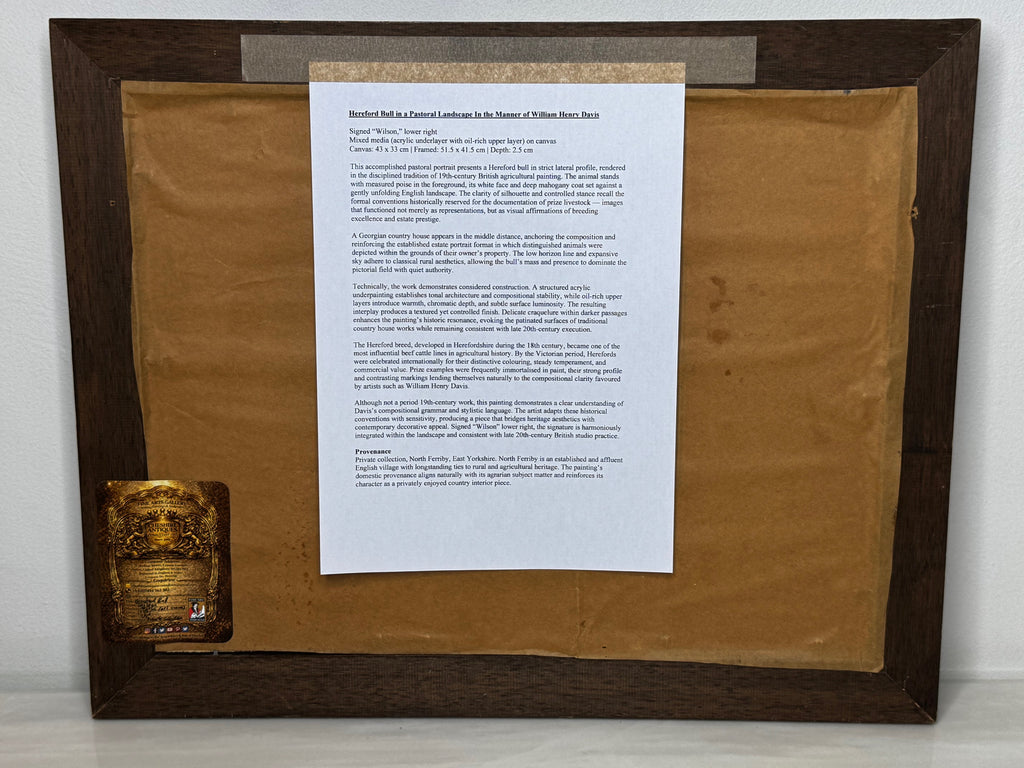This painting is by a late 20th-century British School artist working in the manner of William Henry Davis (1786–1865), one of the foremost Victorian painters of livestock. Davis was renowned for his disciplined profile compositions, architectural estate settings, and reverential treatment of prize cattle.