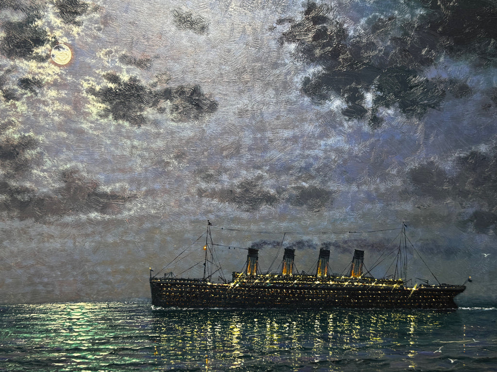 • Monumental, collector-grade maritime nocturne: Titanic underway under a full moon