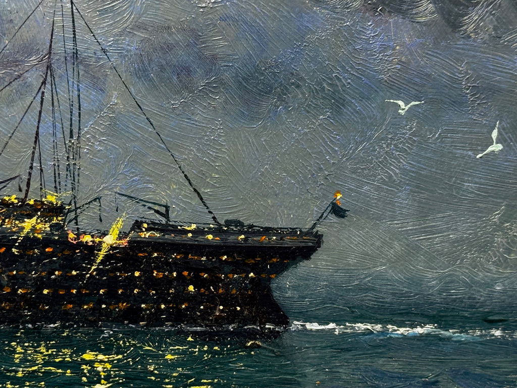 Style / School: Contemporary traditional / academic realism, treated as a nocturne—romantic historicism, atmosphere, tonal contrast, and reflective light on water ⚓️✨