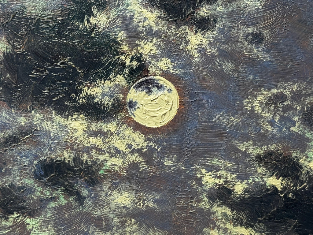 This nocturne is built around light, distance, and stillness. The moon sits high behind broken cloud, casting a long silver path across the sea. Confident layered brushwork lifts deep blue-black water with shimmering highlights.