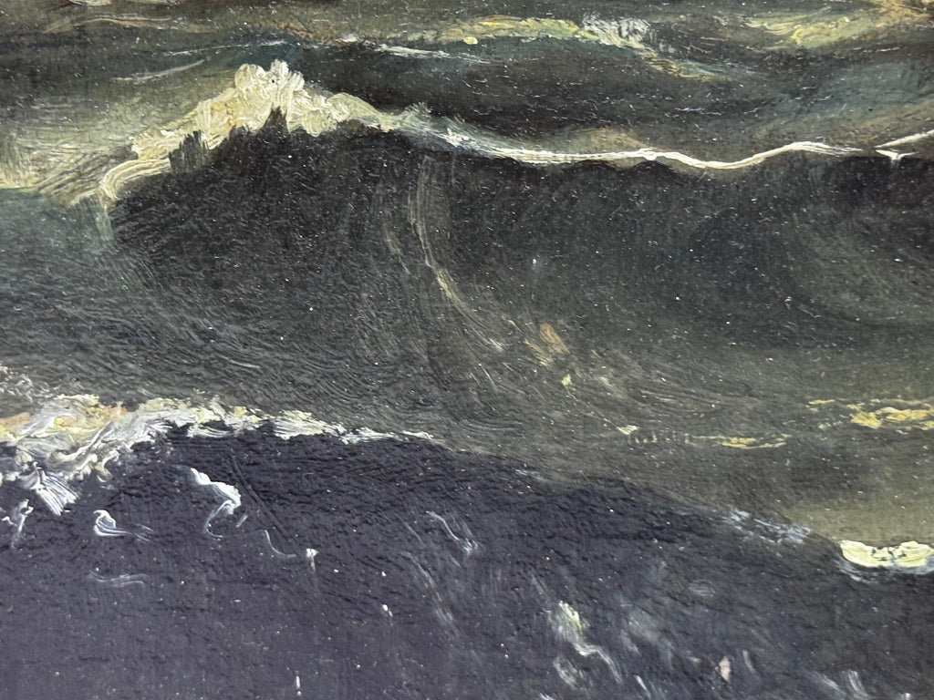 Overall in good antique condition consistent with age 🕰️. The canvas has been relined, and the paint surface presents as stable with expected historical craquelure and foxing patina. There is minor historical overpainting, specifically to part of the sail of the third ship along, and to a small area of the lower sea. These are limited restorations and do not detract from the overall presentation or impact ✅.