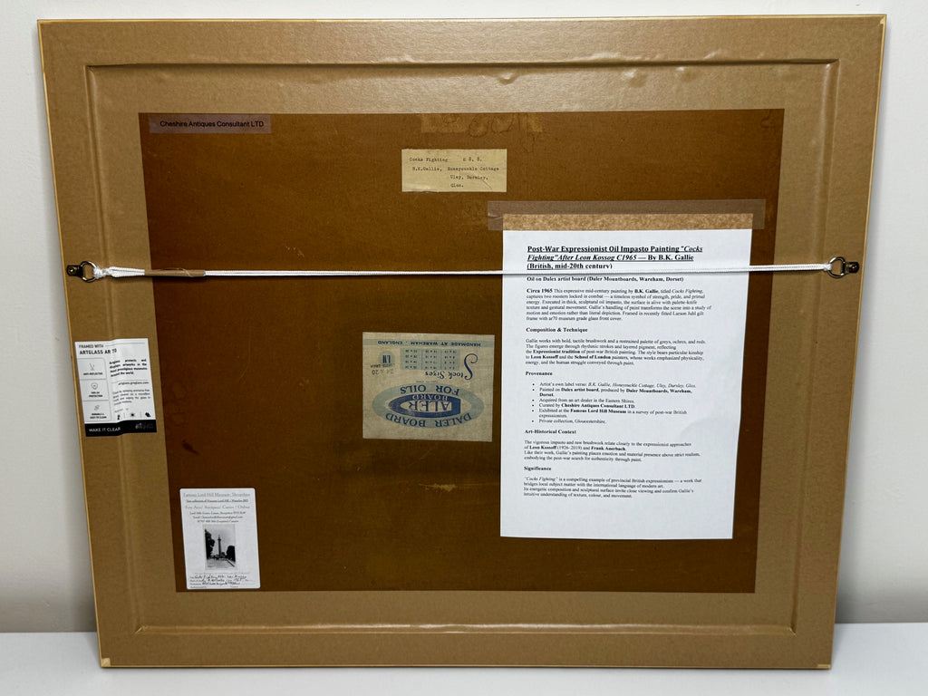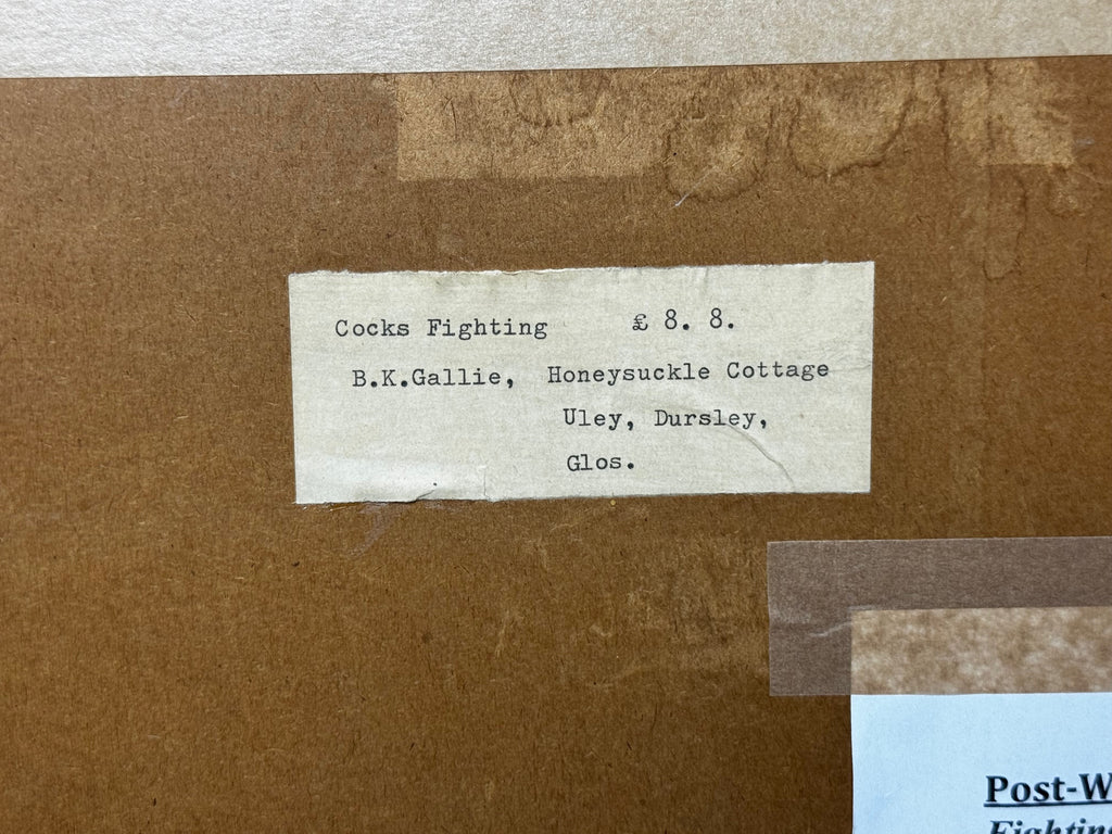A powerful mid-20th-century Expressionist sporting oil painting on board, circa 1965, titled Cocks Fighting, by B.K. Gallie of Gloucestershire (labelled verso).